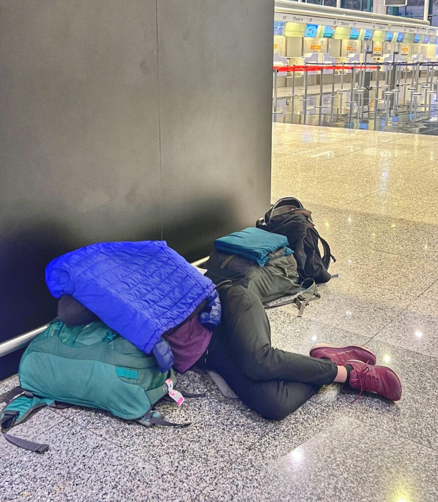 We arrived to Rome at the sprightly hour of midnight thanks to a three-hour time jump, and were tossed landside until we could re-enter security back into the Schengen flights area, which didn’t open til 4:00 a.m. Thus, we got to luxuriate in some ice cold tile napping. Aww….now this feels like the good ol days!!