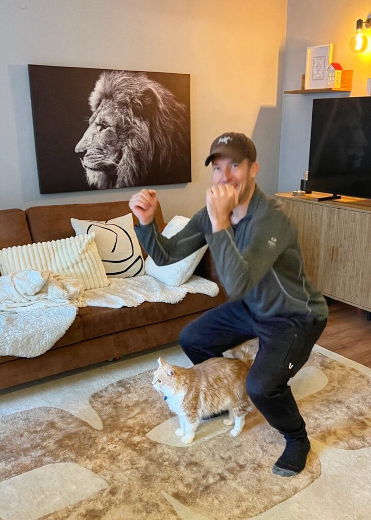 Mr President helps Greg exercise while his mentor hangs on the wall nearby.