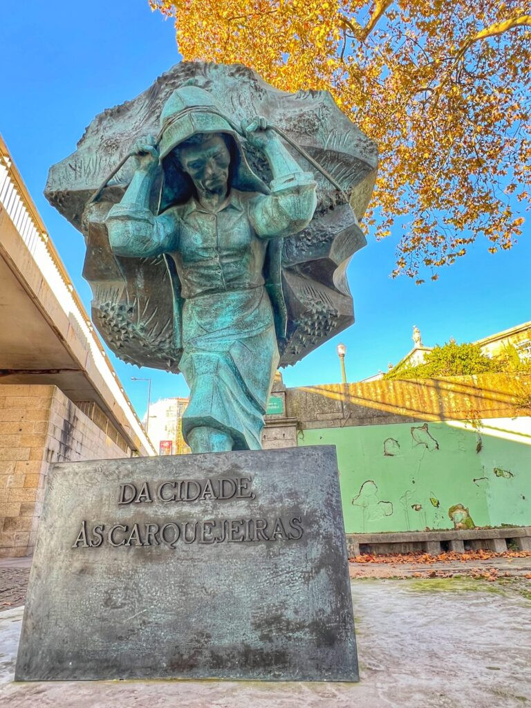 According to the plaque, this statue represents the “Carquejeiras” (Gorse women) of Porto. They were a handful of women who in the late 19th century and beginning of the 20th century, transported 40 to 50 kilos of gorse (spiky shrubs) from the Douro River to downtown and surroundings of the city, through the hard and cruel sidewalks of Corticeira. For many years they contributed to the city’s social and economic development. Despite the important work they performed, they did not have a voice, were not respected in their human condition, and were not praised.