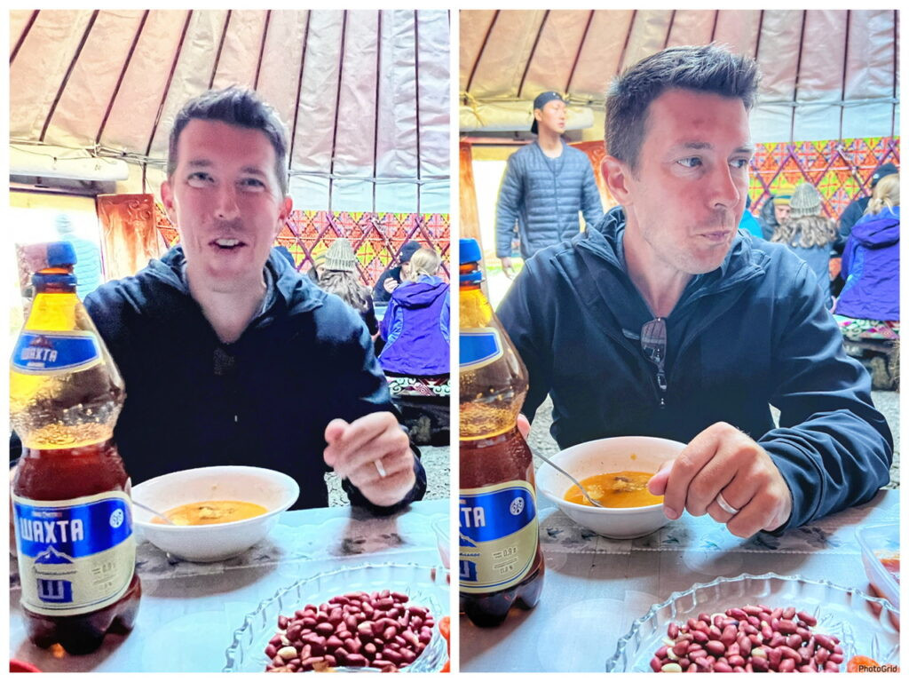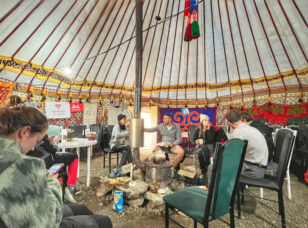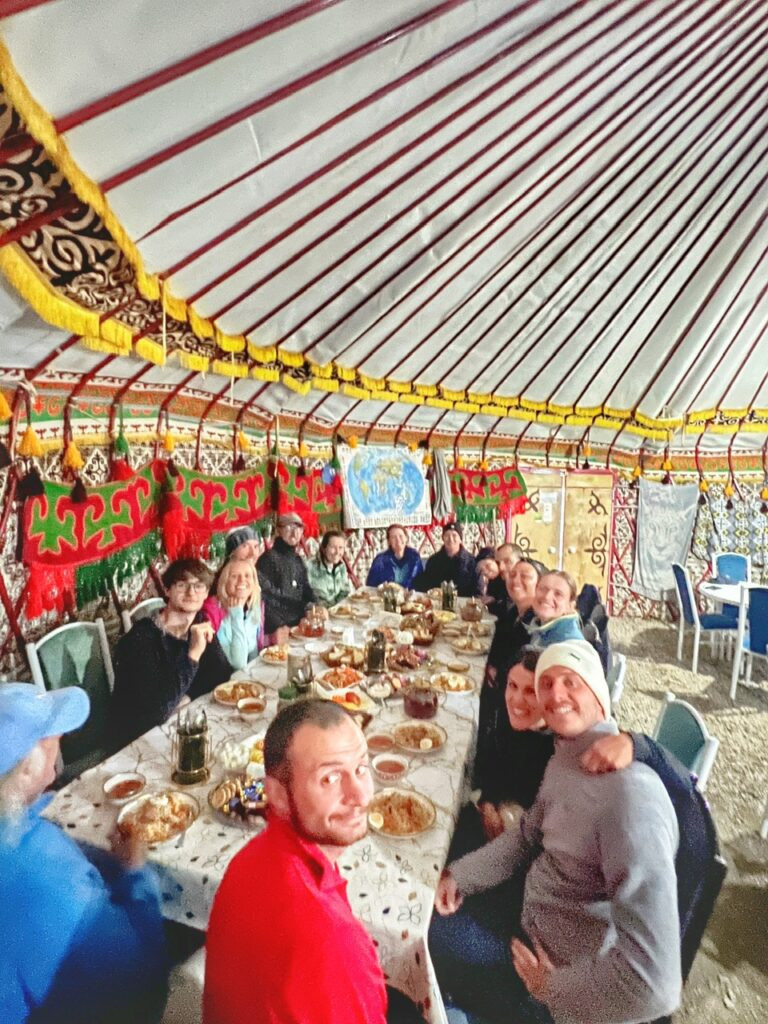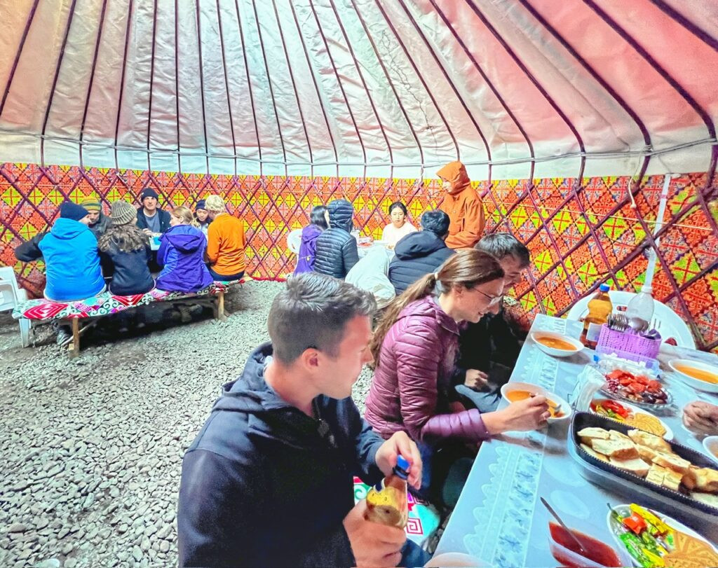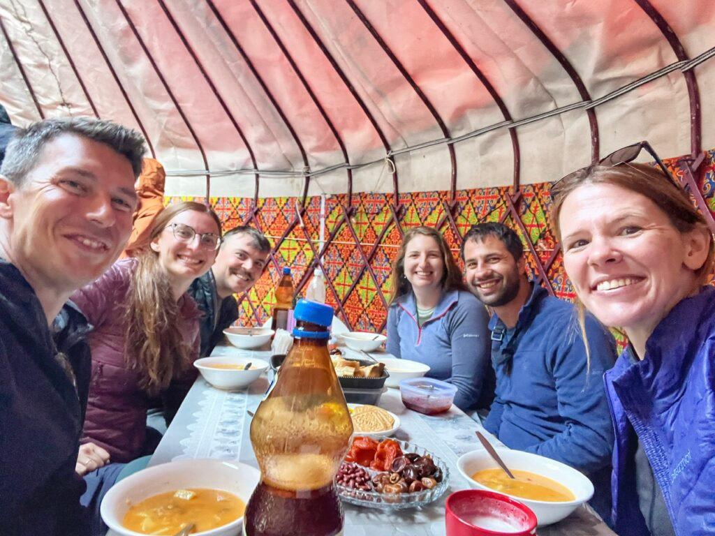 Our community dining yurt, where three tables lined the perimeter. By chance, we sat with the Czechs, as well as an Israeli couple, Yuval and her partner, who also happened to be our yurt-mates. The two couples both happened to be on their honeymoon. We suspected they were cool people if they’d chosen Kyrgyzstan as their honeymoon destination and they definitely were!