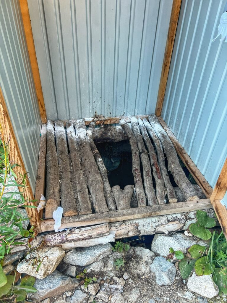 Also, this time, the squatty potty floor was made of real wood, not sticks! Comically, the next morning, we saw Mark emerge from it with only one slipper on. He had managed to drop the other one into the hole of no return. Oops. 🤣