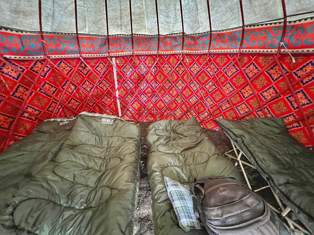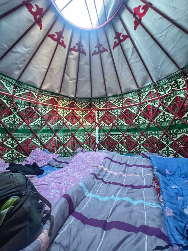 A bit later, we got showed to our yurt, which featured cots, cozy flannel sheets, giant sleeping bags, and even flip flops, which were much welcome after the day of hiking we’d had. We were also ecstatic to have it to ourselves…all in all, way comfier than the night prior. Additionally, the price was $5 cheaper per person making it $45/person, which included breakfast and dinner. It was still quite expensive, but we felt it was much better value than Bulak Say.