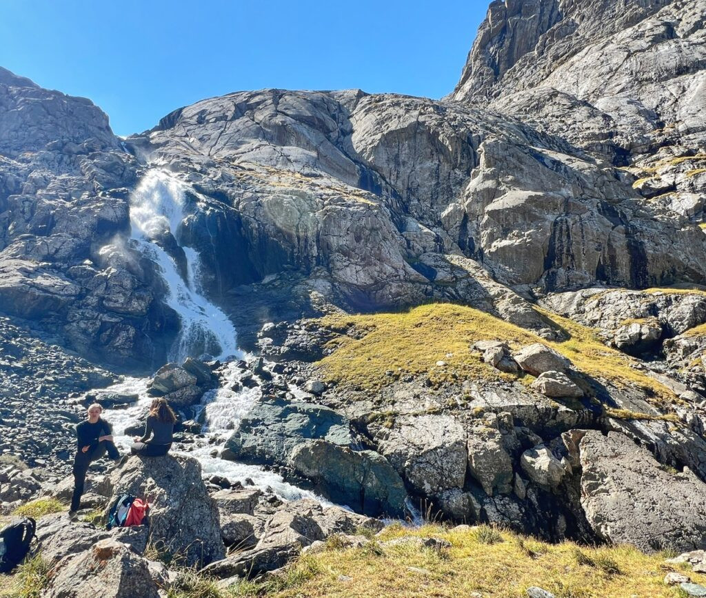 Much of the morning, we would steadily amble alongside this stream of glacial whisper, as the sun slowly began to glide upon the shadows. Other times, we would grunt and puff a bit less tranquilly. But, at last, we reached the peak of the cliff, where we would find a waterfall toppling as run-off….