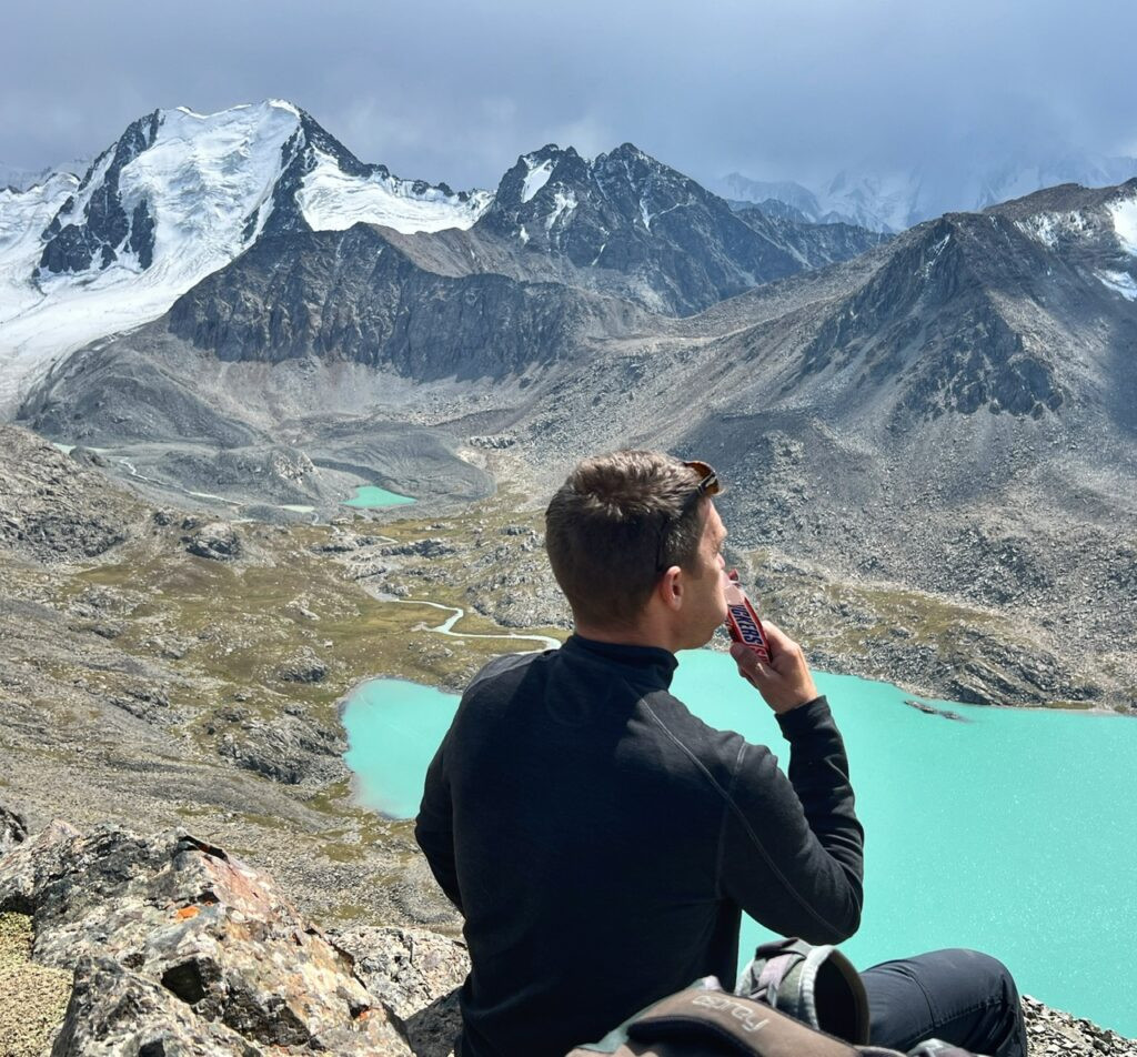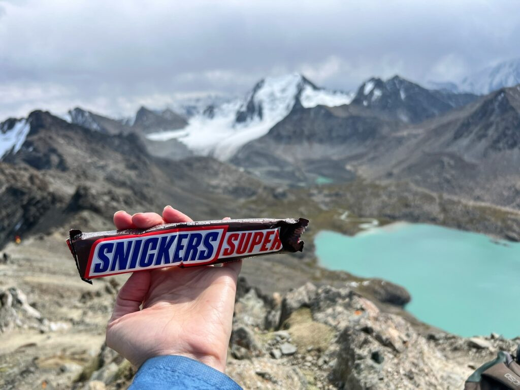 At last, we made it to the ridge, where a small cluster of other hikers were soaking in their gratifying reward. From here, we could see peaks that were pushing over 5000 meters (16k feet). Ours would also include this…an indulgence we rarely let ourselves have otherwise. This time it seemed well-earned considering we’d just conquered the equivalent of about three Eiffel Towers climbs. Funnily, a French guy was also savoring a Snickers at the top. 😂 Greg ate his like a chipmunk, making every nut count.