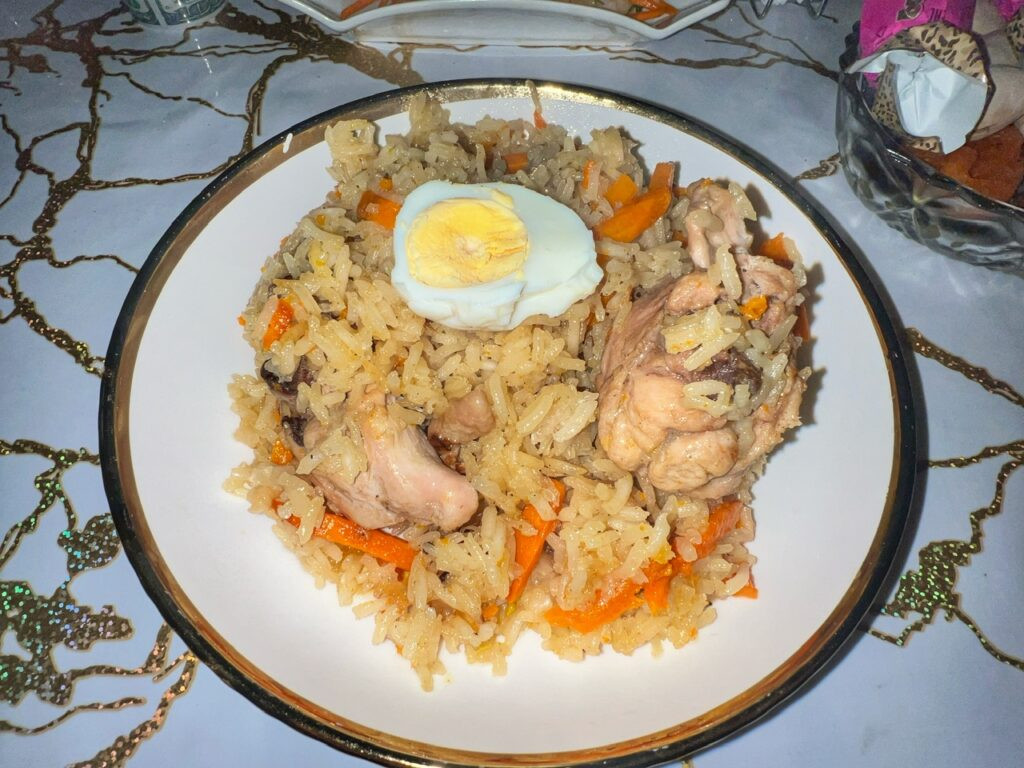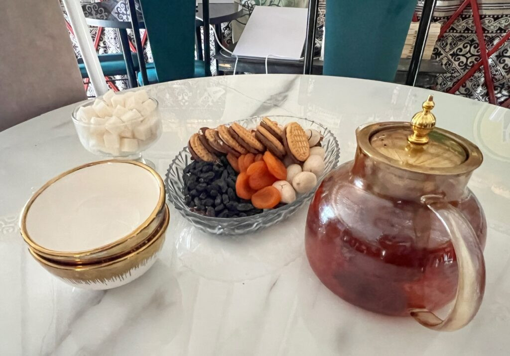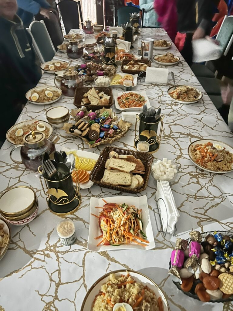…while we waited for our feast, which again was much improved over the plain pasta the night prior. This time, we finally got to have Plov, which is a cornerstone of Central Asian cuisine. It’s made of rice, carrots, onions and meat; in our case, chicken. It was a warm and comforting meal after a challenging hike. There was also a delicious salad, breads, fruits, sweets, and of course…lots of tea.