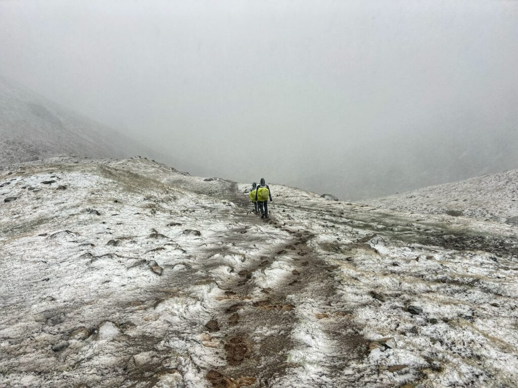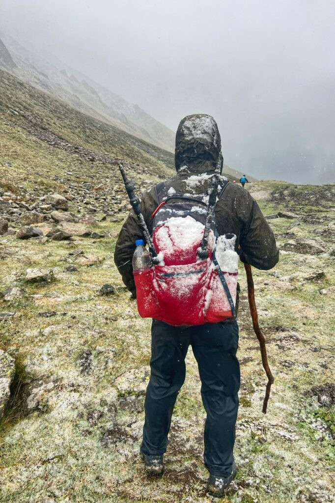 Gazing back toward the shrouded pass we’d descended the day before. After a (delayed) three-egg breakfast and some tea, we set off on the trail donning every layer we had, as the snow blew sideways.