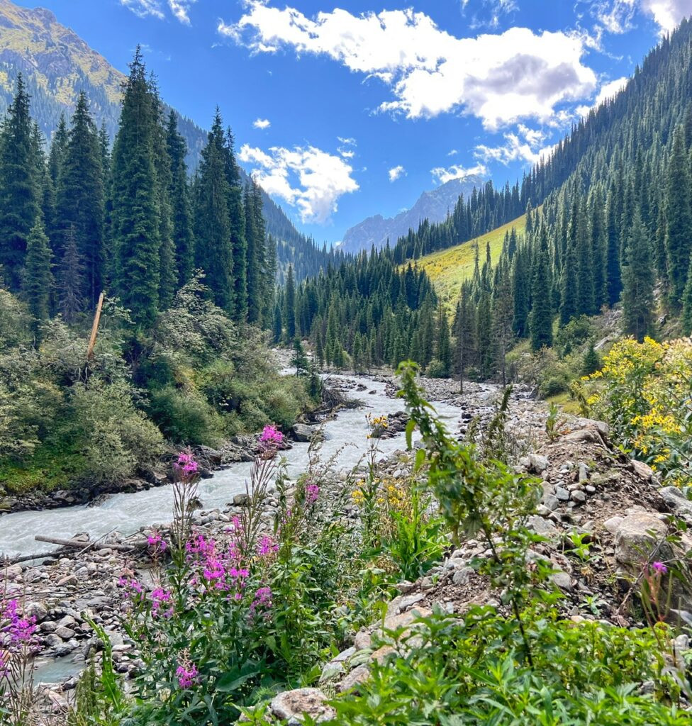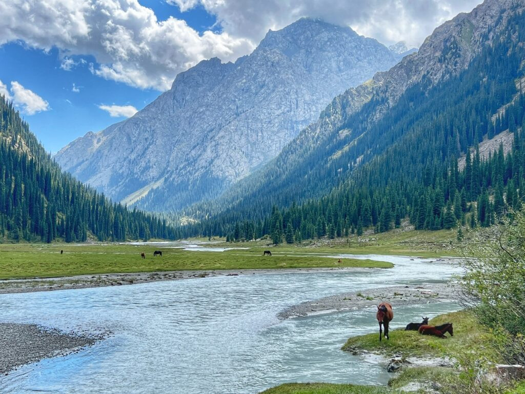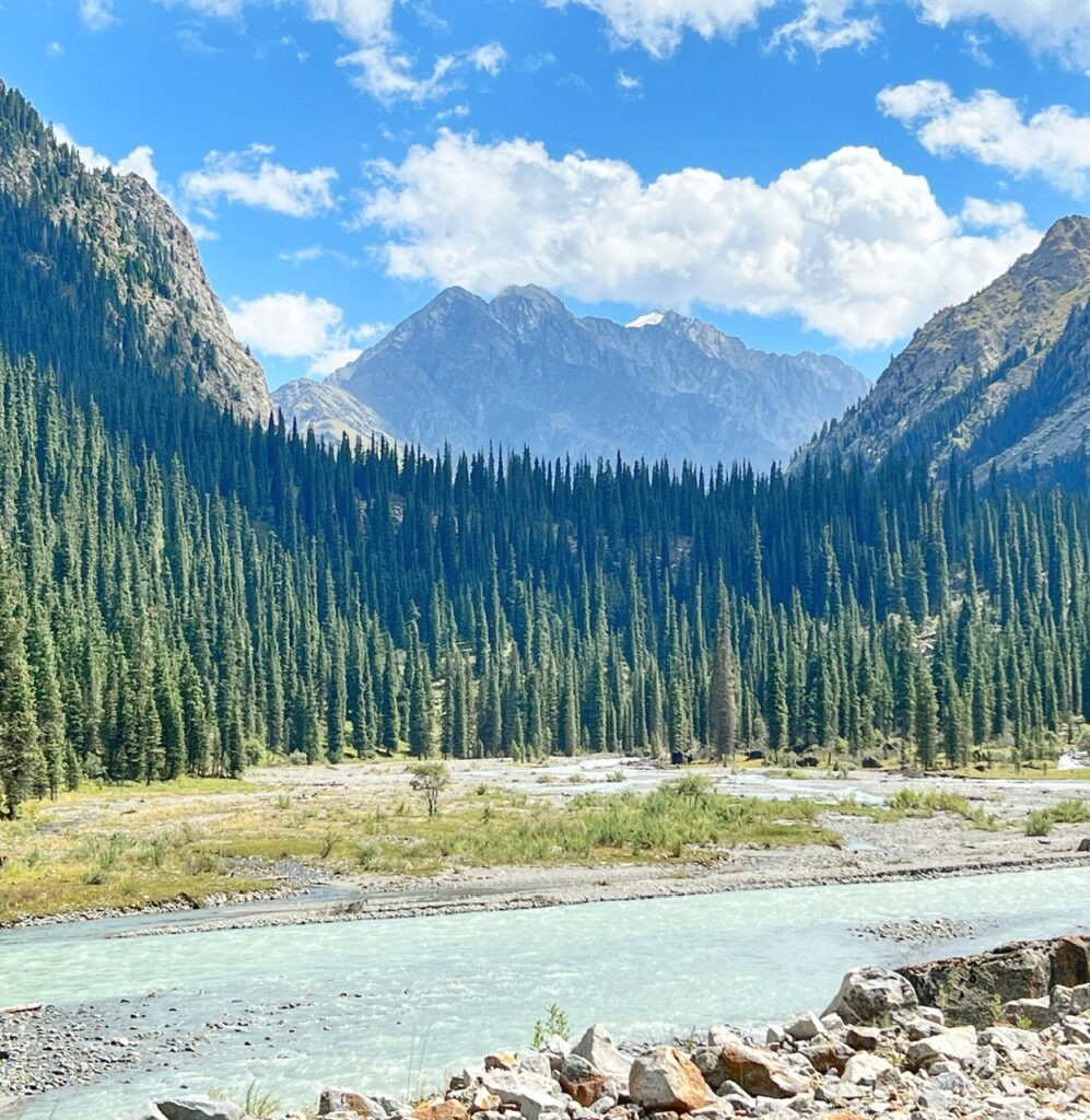 The range we had been in thus far is called the Tien Shan Mountains, which appropriately means “Heavenly Mountains.” It is laden with stunning meadows…horses grazing……majestic evergreen trees…and glaciated waters.