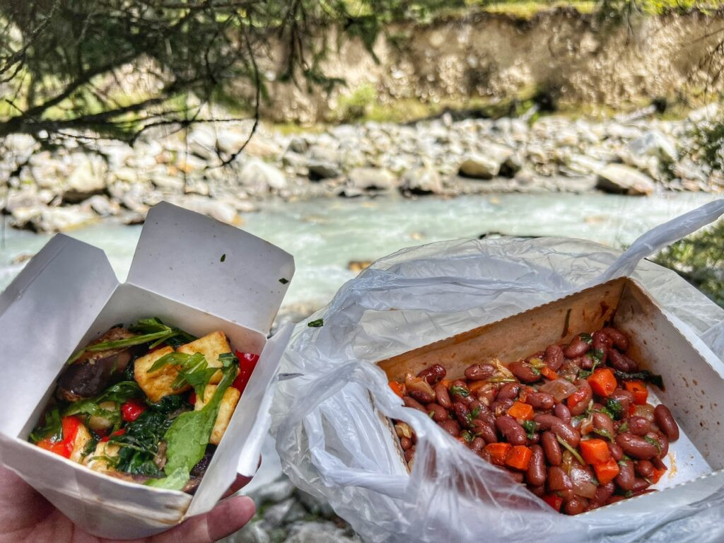 Pausing for our first lunch alongside the river, which would inevitably be the best one due to lack of refrigeration moving forward. Showing off our supermarket salads, which included an eggplant/tomato/pepper and cheese dish, and a red bean and carrot mix.