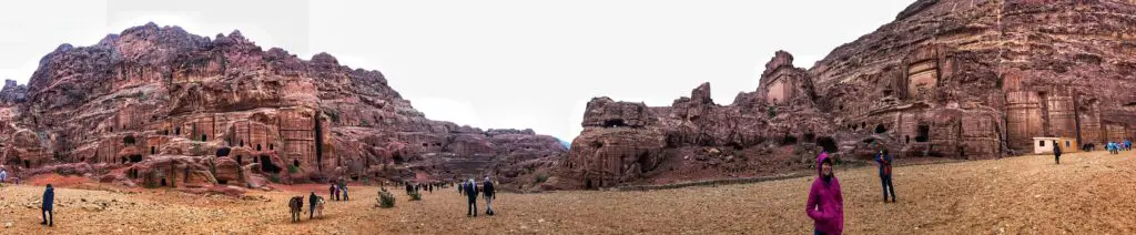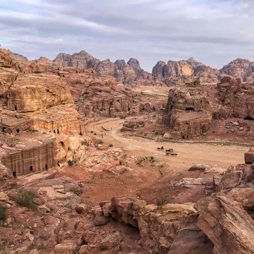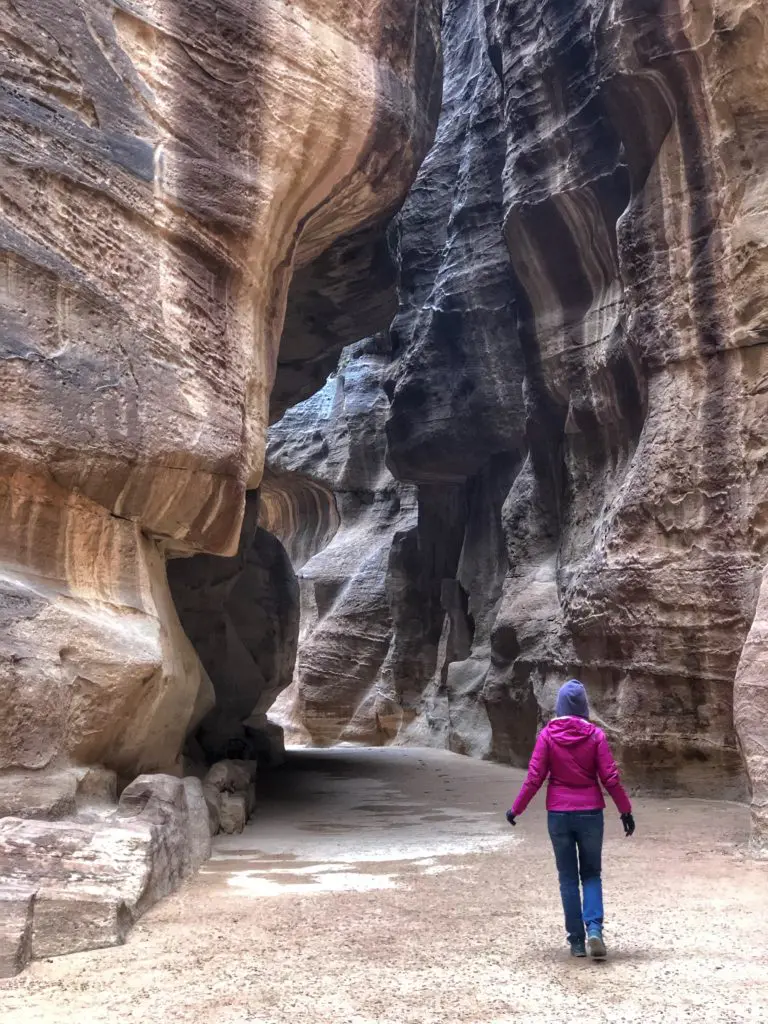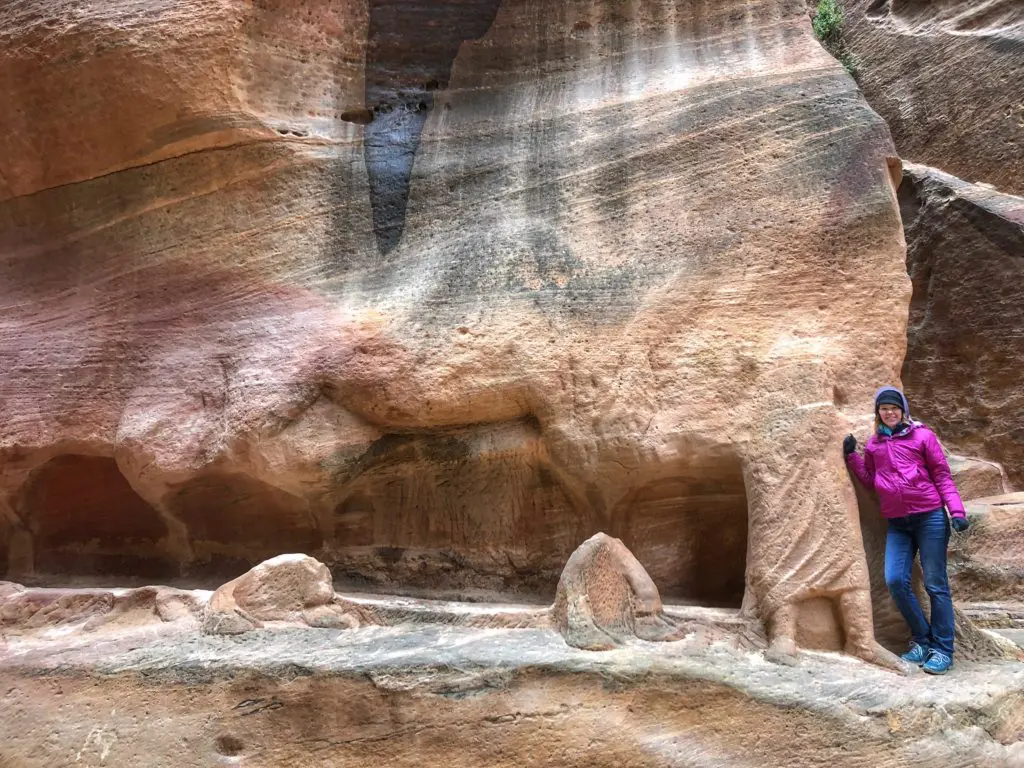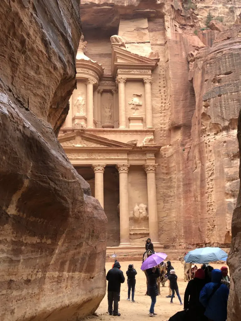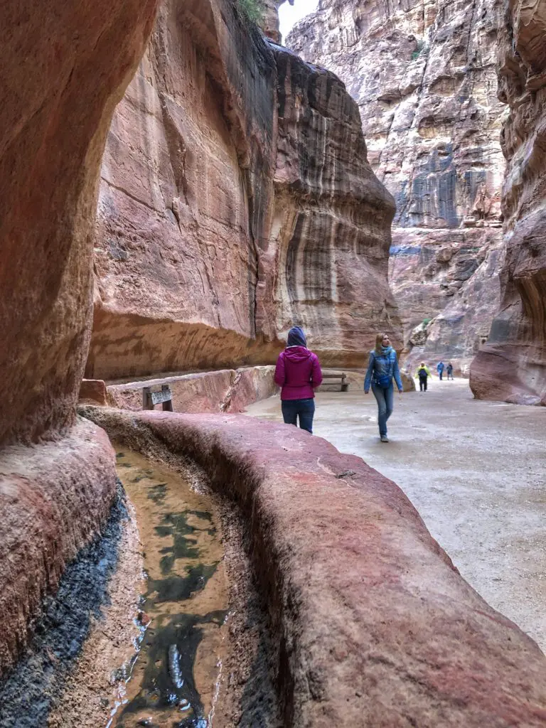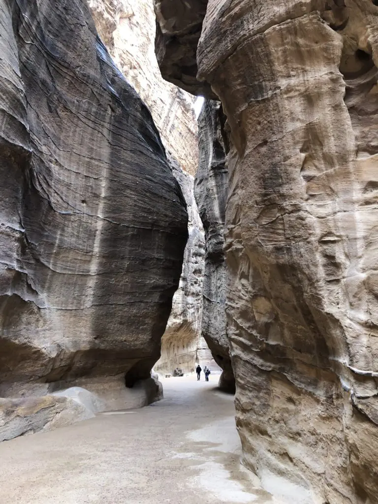 We had two days to explore the remarkable 2000-year-old Nabatean city of Petra and one of the New 7 Wonders of the Ancient World. It’s hard to imagine that a city can be built from carved rock facades, but when you glimpse Petra firsthand it’s clear… this was an ancient and functional city of rock in the desert. And as you can see, getting there at 6:30 am was well worth it for dodging crowds and getting epic pictures. After parking, it was time to amble our way through the serpentine Siq, or canyon. Surprisingly, it is not actually a canyon. It was actually formed by two tectonic plates that split the ground apart long ago. You can see this in places where one side of the Siq perfectly matches the other. This is one of three ways to enter Petra and is the most traditional as the other two require guides.