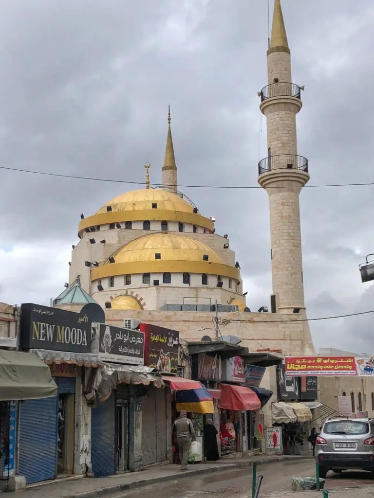 Our Jordan journey began 10:30 pm when we landed at the international airport in Amman. In an adrenaline-filled travel fog, we quickly picked up our car, visited the ATM for some Jordanian Dinars, and drove 25 minutes to the town of Madaba. We learned quickly to slow down and keep an eye out for the random, un-signed, and unmarked speed bumps on the roadways. Also we learned that being in the Middle East does not equal warm weather… it was 36F (3C) when we came out of the airport!! Later, the next morning waking up to our first Islamic Call to Prayer dreamily echoing through the city streets at 5:00 A.m. was a surreal reminder of being in an Islamic country, and a lovely way to welcome the day. Out and about in the chilly air we headed into Madaba to check out the sights, including this lovely gold domed mosque and shopping area.