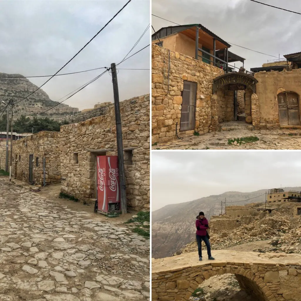 The next day we tried to go to a hot spring off the King’s Highway and sadly there had been a landslide due to the recent torrential downpour the night before, so we couldn’t go. 🙁 Instead, we headed to the charming 15th Century Stone village of Dana perched thousands of feet up on a cliff overlooking some wild and beautiful mountain terrain. If it hadn’t been raining sideways, and bone-chilling wind, we probably would have hung out longer to check out the very tempting looking hiking opportunities in the adjacent nature reserve.