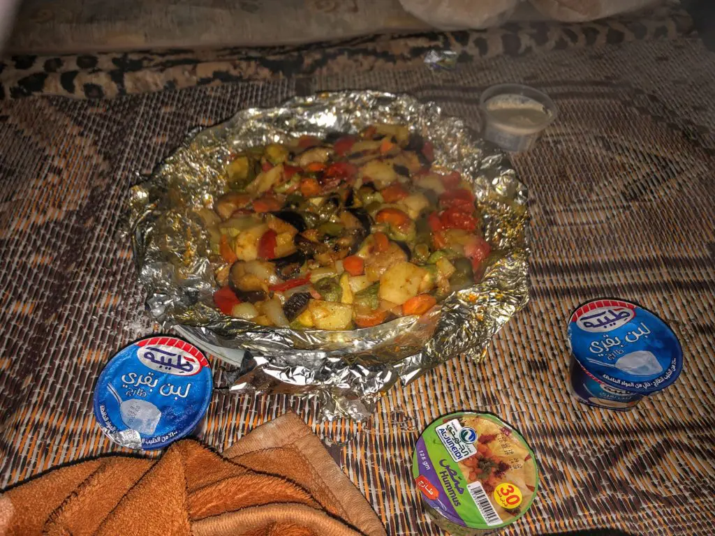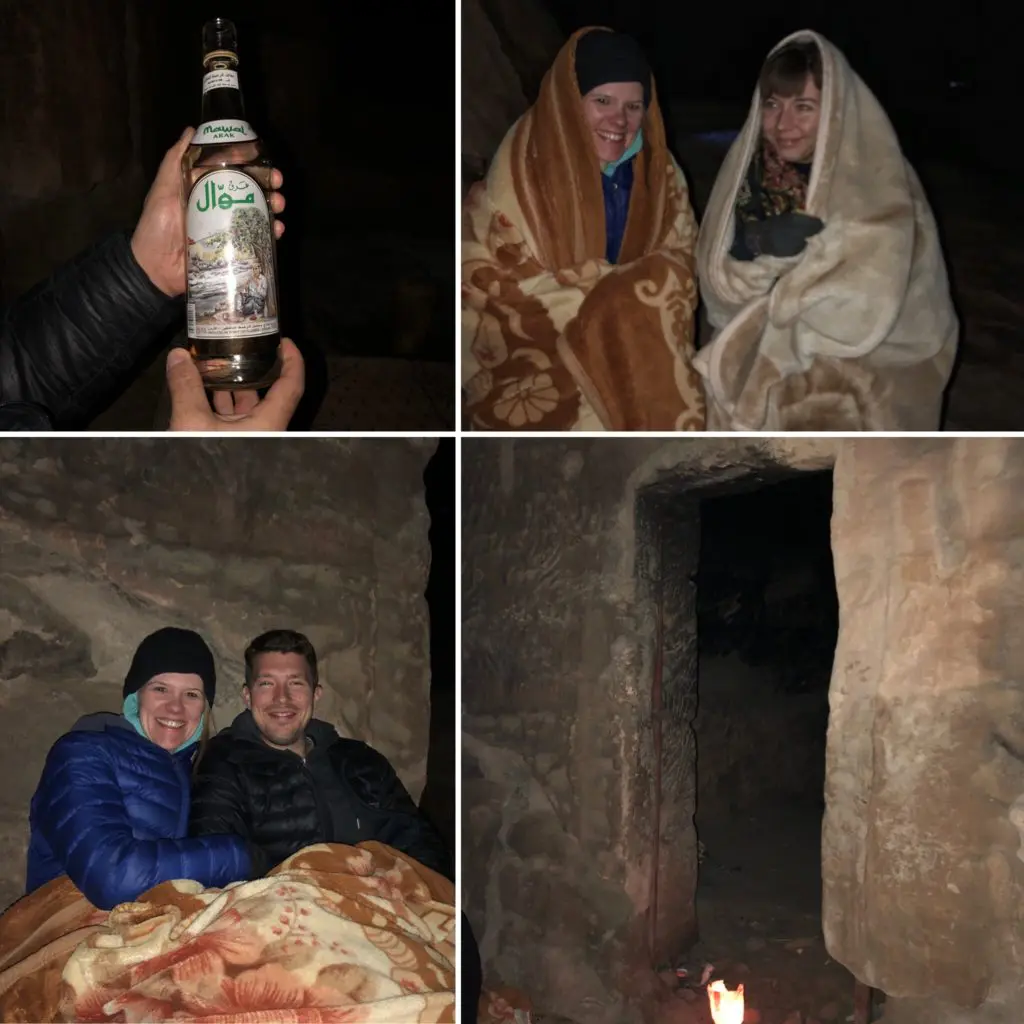 We planned to wrap up our last night in Little Petra by sleeping in a Bedouin cave we found on Airbnb. Unfortunately due to some logistical reasons, the cave sleepover, didn’t happen but we still got to have a fairly authentic Bedouin experience by having dinner at the cave in lieu of sleeping there. In order to keep warm in the upper-30’s weather, they provided us with pads to sit on, giant blankets, and even our first Jordanian made spirit (it does exist!), called Arak. It had a heavy anise flavor and was delicious… and 52%(!) ABV.