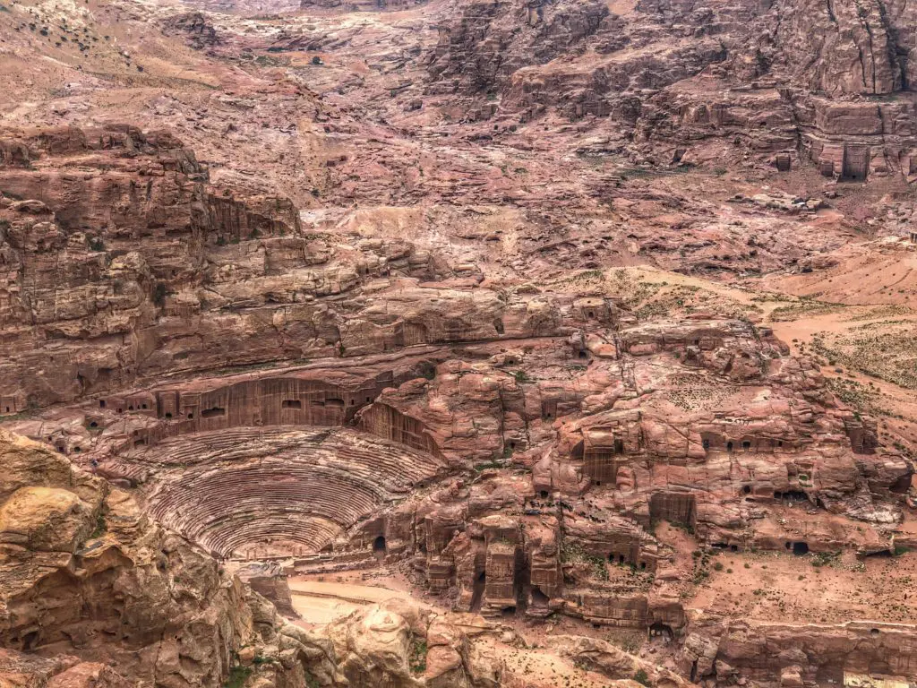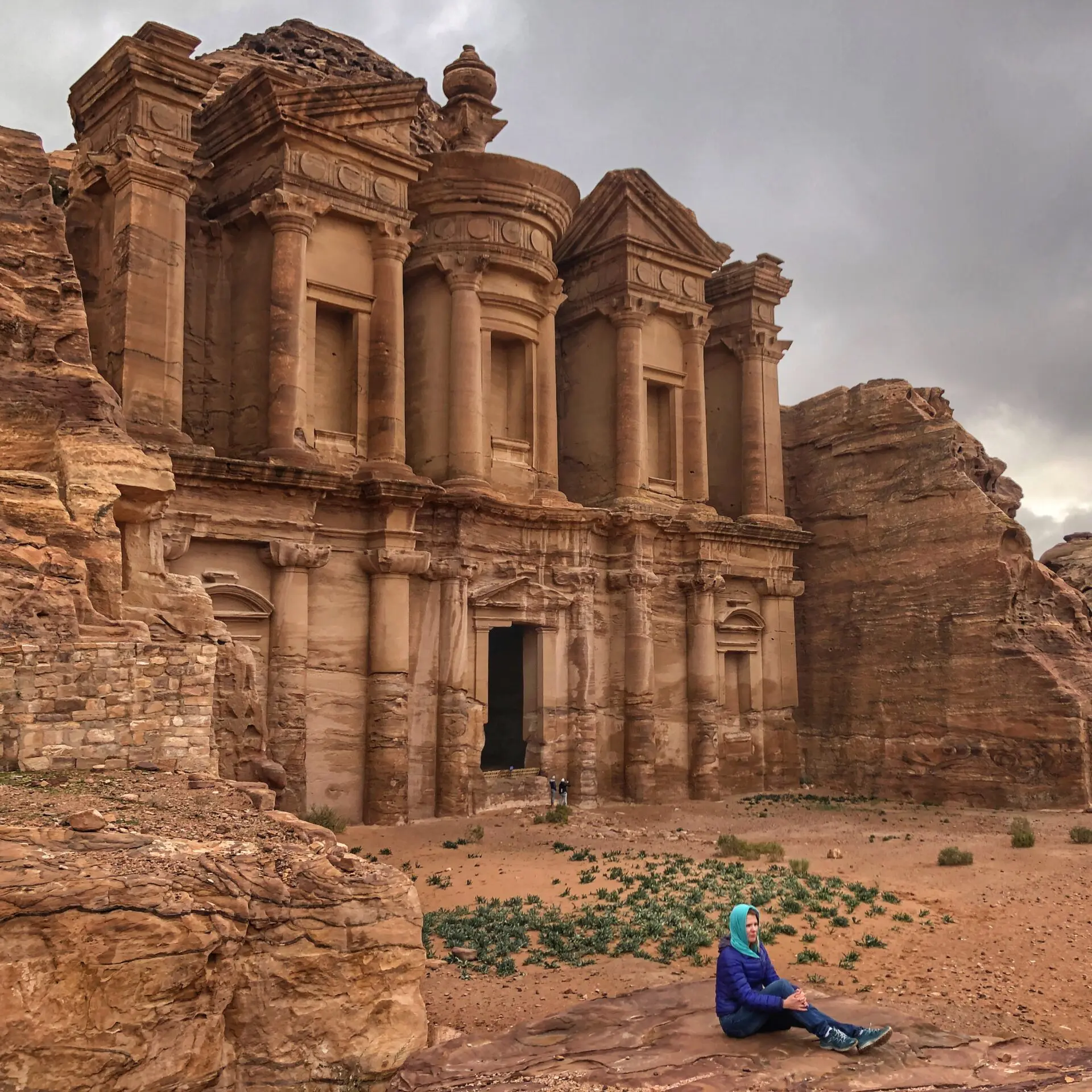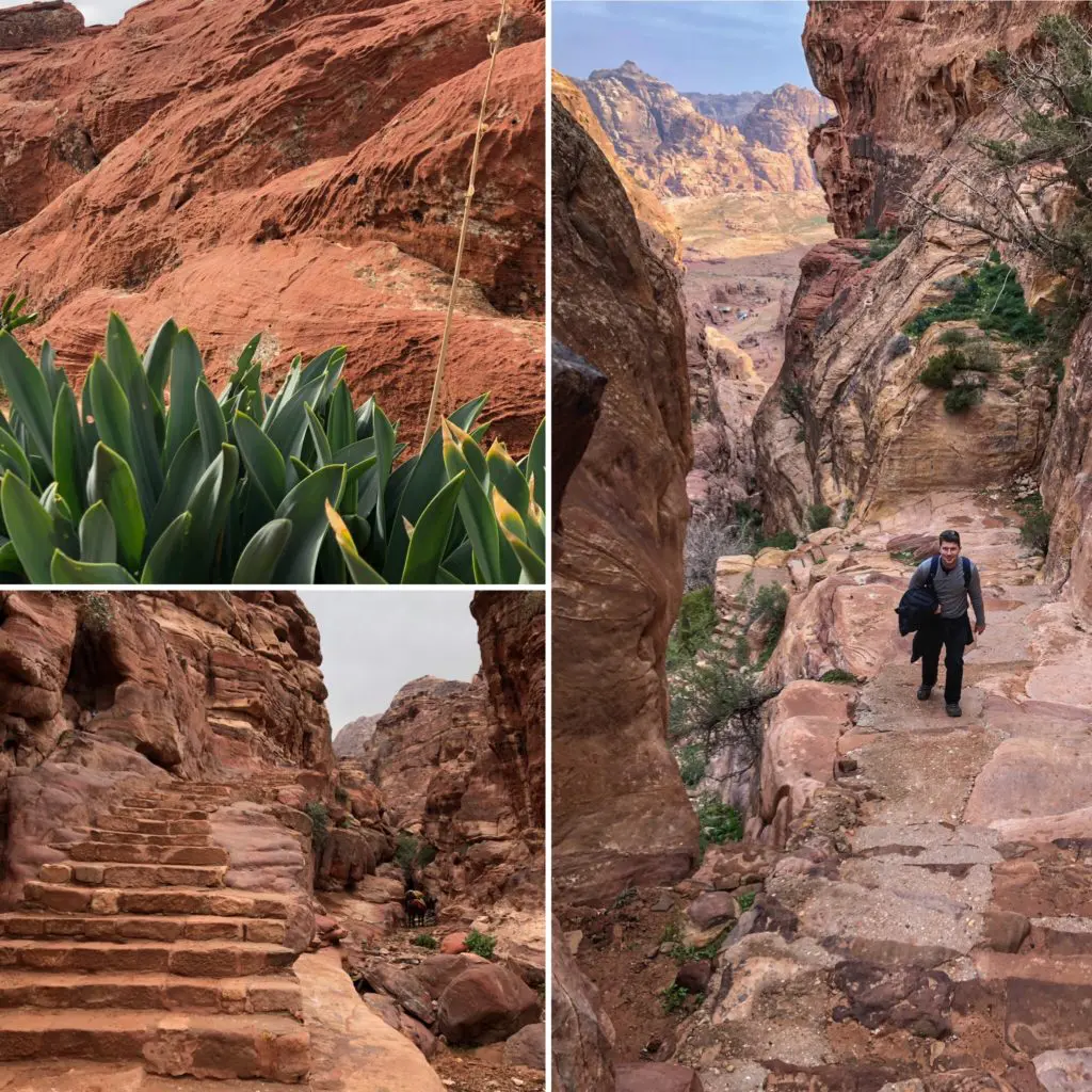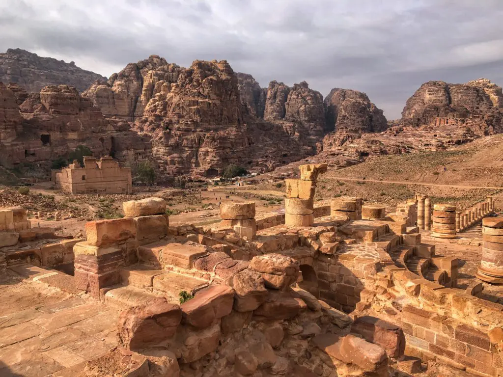 Put your walking shoes on because Petra is huge! Both days we clocked over 25,000 steps. You also have the option to take horse, camel, or donkey rides if that much walking sounds miserable to you. On the first day, we decided to start by walking the full length of the city to get to the monastery (about 5.5k) Don’t be fooled…you don’t have to have a guide to get to most places in Petra, but of course it does benefit the locals and “guides are recommended.” Also, if you do hire a guide, don’t take the first offer from an ad hoc guide or a pushy kid a foot shorter than you! As you climb up from the main city toward the monastery, there are plenty of vendors to gawk at along the way to either entertain, or distract you. In the background, Qasr Al Bint structure was built around 40 BC by the Nabateans. Once 23 meters high, it was probably the main worship place. The Nabateans were polytheistic as was trendy at the time, and worshiped many gods, including Greco-Roman ones.
