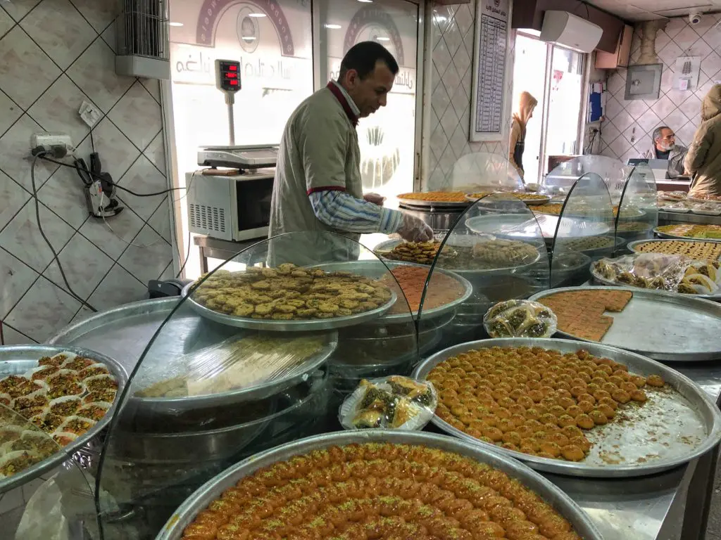 Also, we were big fans of the Arabian sweet shops. Since alcohol is often a no-go in Jordan, we’ve learned sugar is the locals favorite vice. Oozing with flaky pastry crusts, nuts, cinnamon, honey, custards and syrup, they are to die for! Not to mention they kept “forcing” free samples at us.