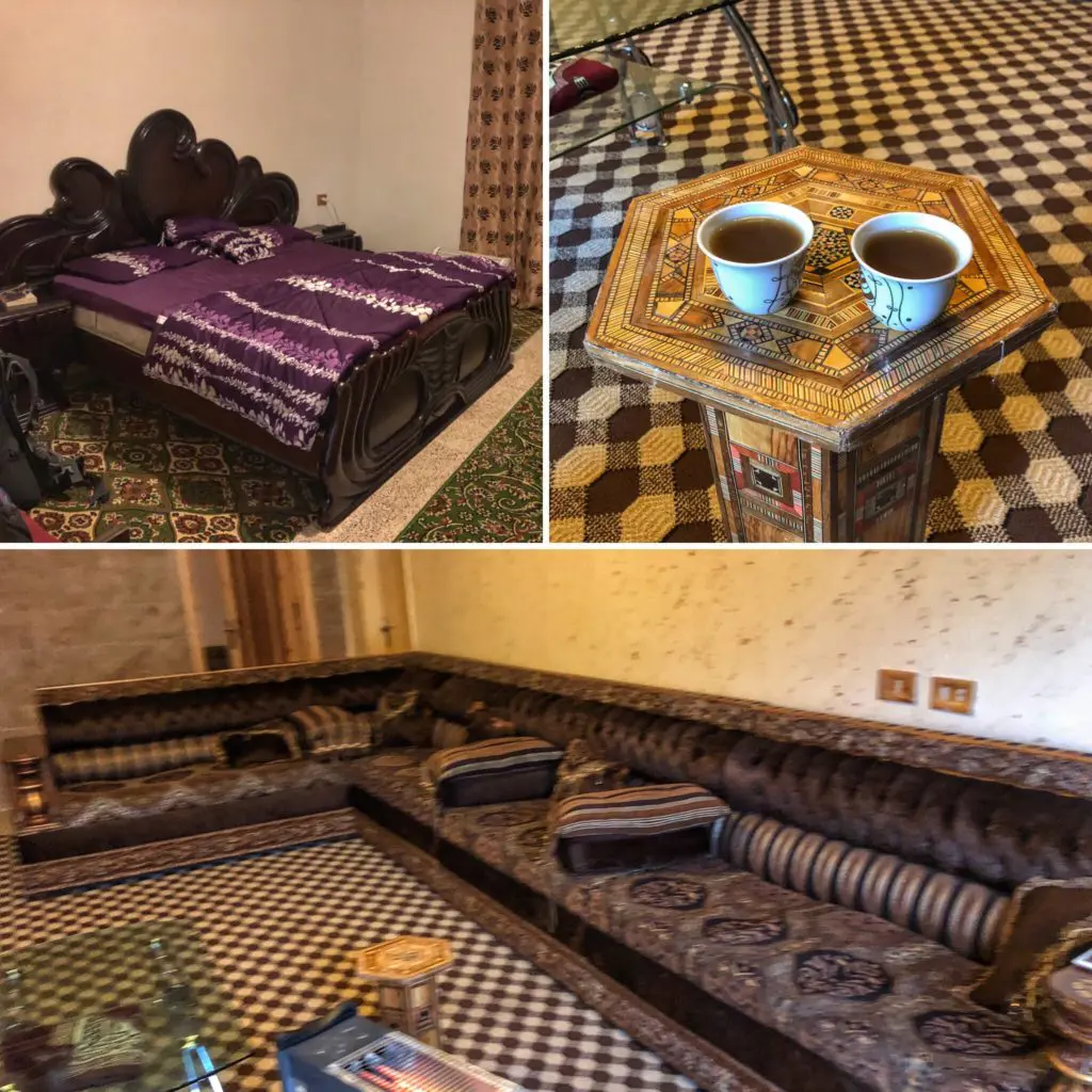 In Wadi Musa, the town nearest to the ruins of Petra, we checked into our Airbnb ($36) and were greeted by our wonderful Bedouin host family with Arabic coffee made with cardamom. In our room we found a gigantic bed, and a sofa big enough to hold the whole village in the living room. It was made of 8 4’ sections and isn’t even all pictured!