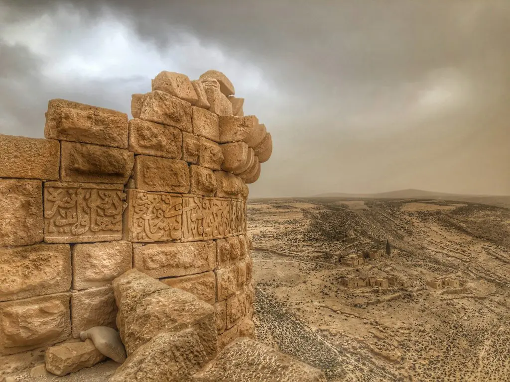 Visiting another significant crusader castle in the small village of Shobak along the King’s Road. Built in 1115. Here on the castle walls, you can still see Quranic inscriptions from around the time of Saladin. By the way, check out the yellow sky in this unedited picture. That’s what a dust storm looks like in the desert! It was eerie.