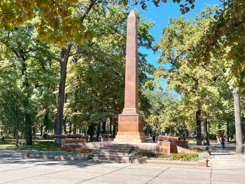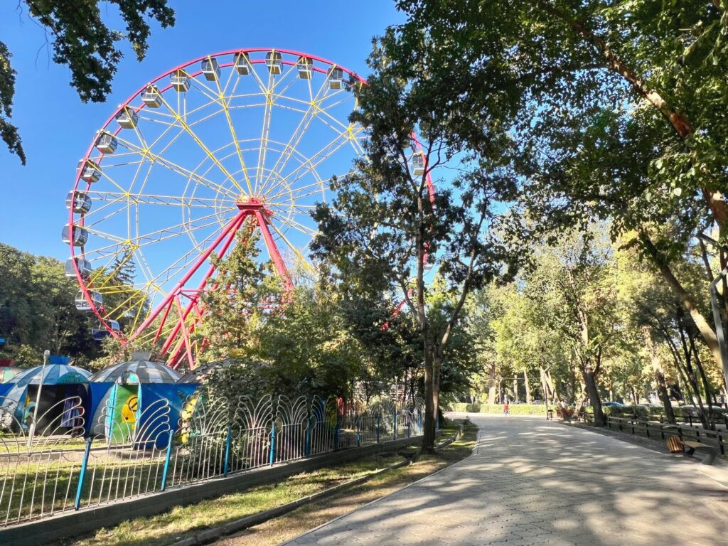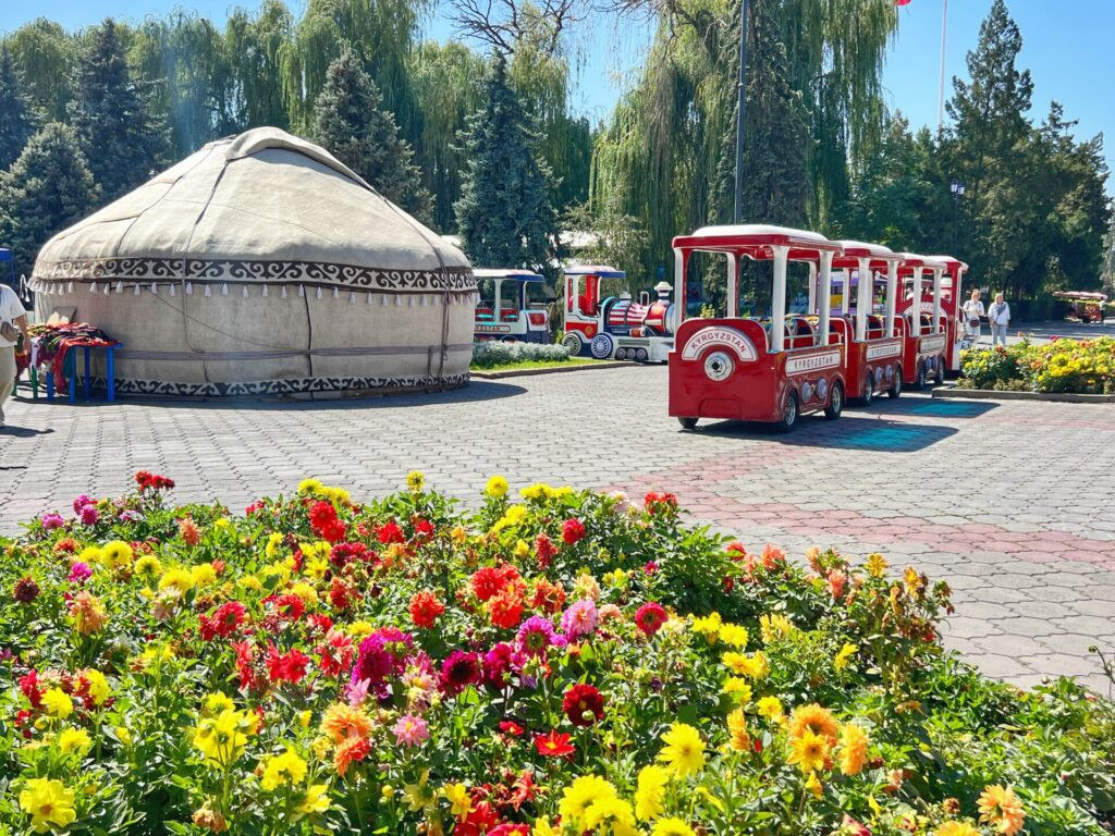 The lush central walking area of Bishkek called Oak Park where you had to be a bit cautious due to the acorns releasing like unanticipated bird bombs. Of course, you’re a little safer if taking the train. 🤣