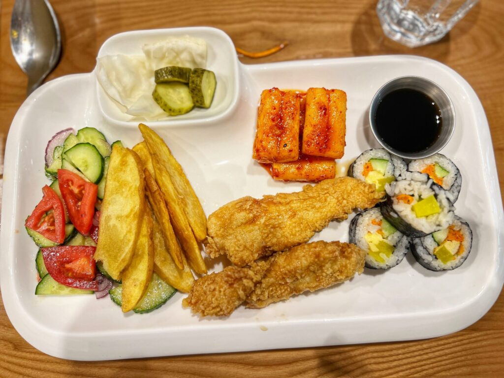 For lunch on our day in Bishkek, we sought something besides Kyrgyz food, so we ended up at a quite scrumptious Korean joint called “Chicken Star.” I finally got a pile of un-meated tofu mounded atop a delightful Bibimbap, while Greg got one of the lunch menus which had a terrific mix of Korean street foods. It was so nice to have something different! Naturally it cost more at $14 for the meal.