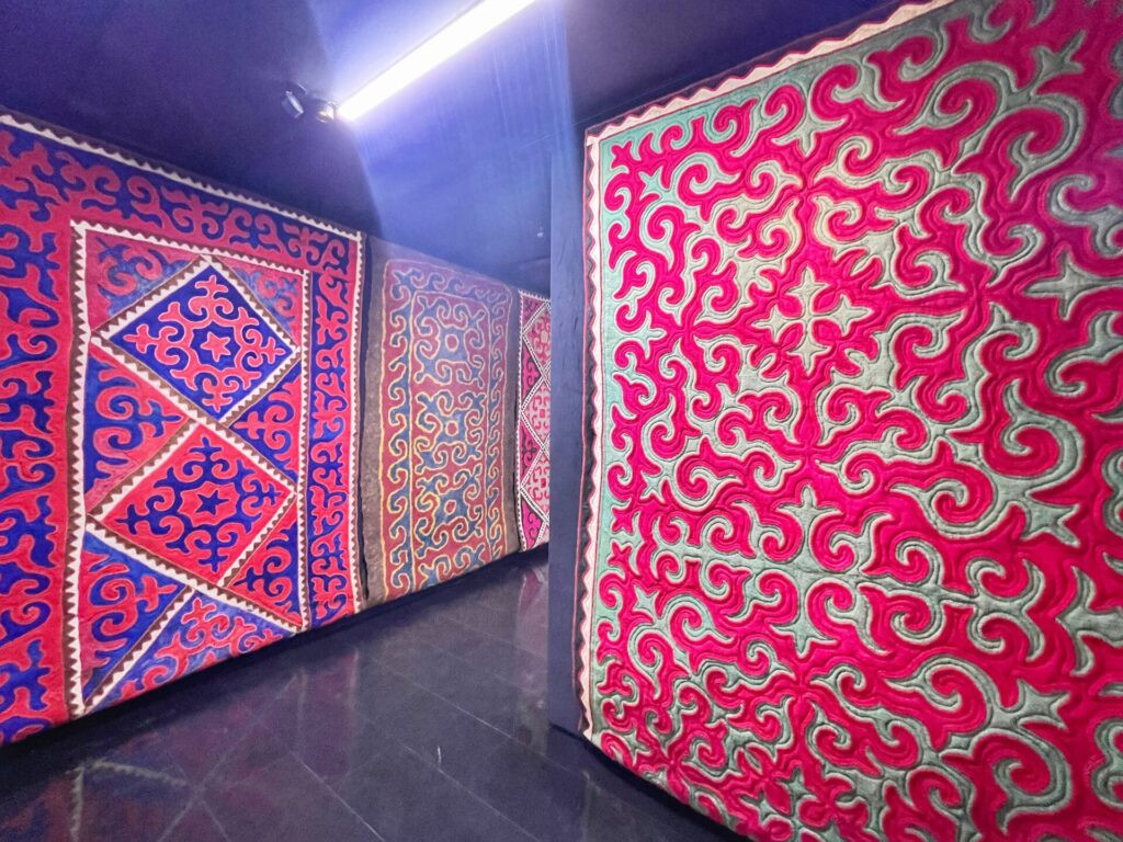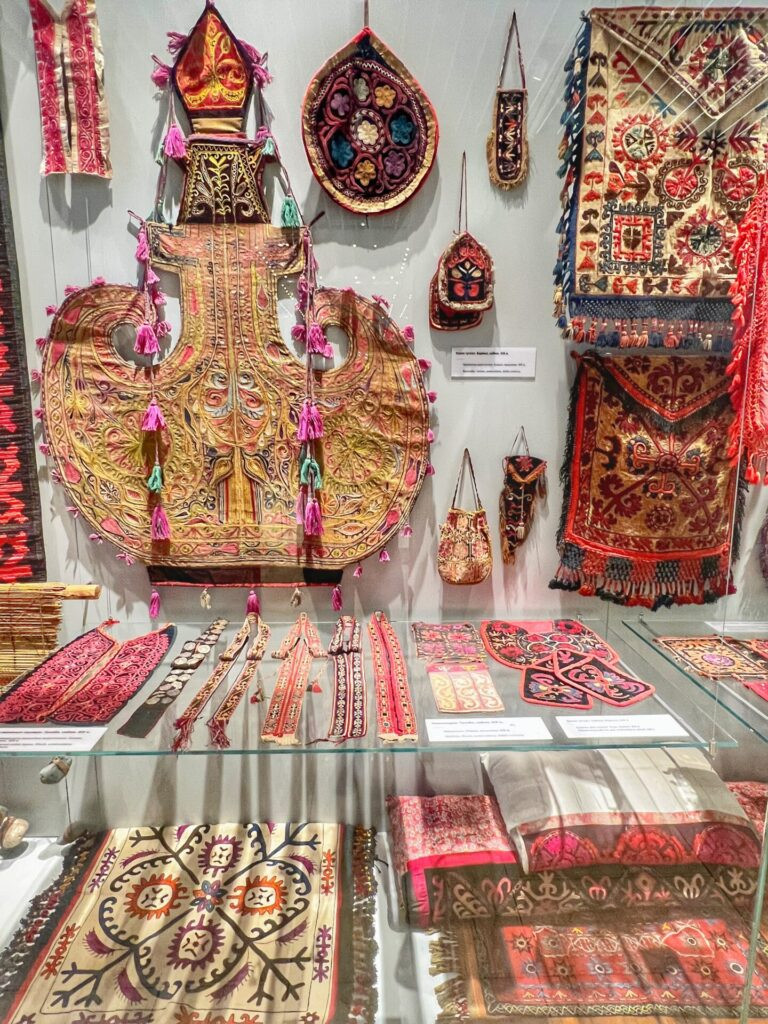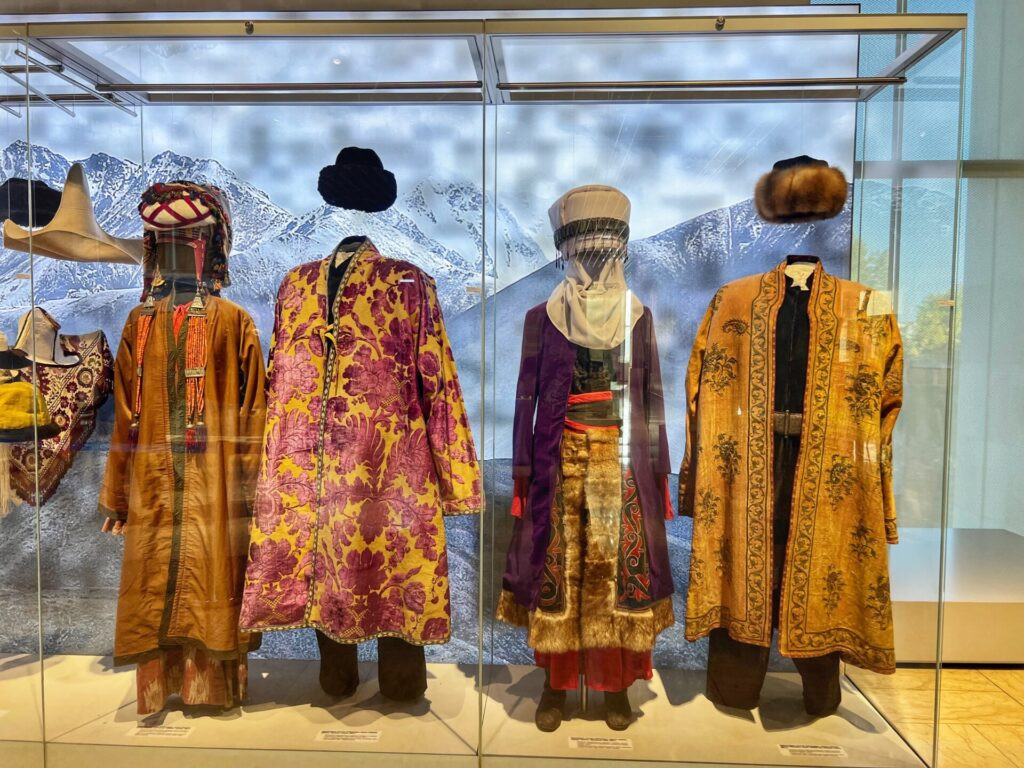 One of our favorite sections of the museums featured traditional clothes of Kyrgyz people, which embodied the long-term traditions of the material culture of the people. It adapted to the sharply continental climate and was sewn from hides, suede, wool. Later, they used imported fabrics like chintz, silk, velvet, and plush.