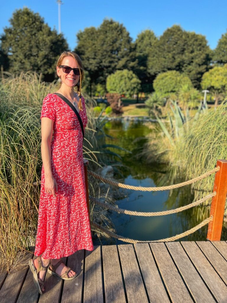 Entering the park, there are many fetching mosaic staircases leading down to the busy road, which runs UNDERNEATH the park….where all traffic belongs, in our opinion. Also, Mandy modeling her new (Bulgarian) dress in the park, which is very pleasant to stroll in.