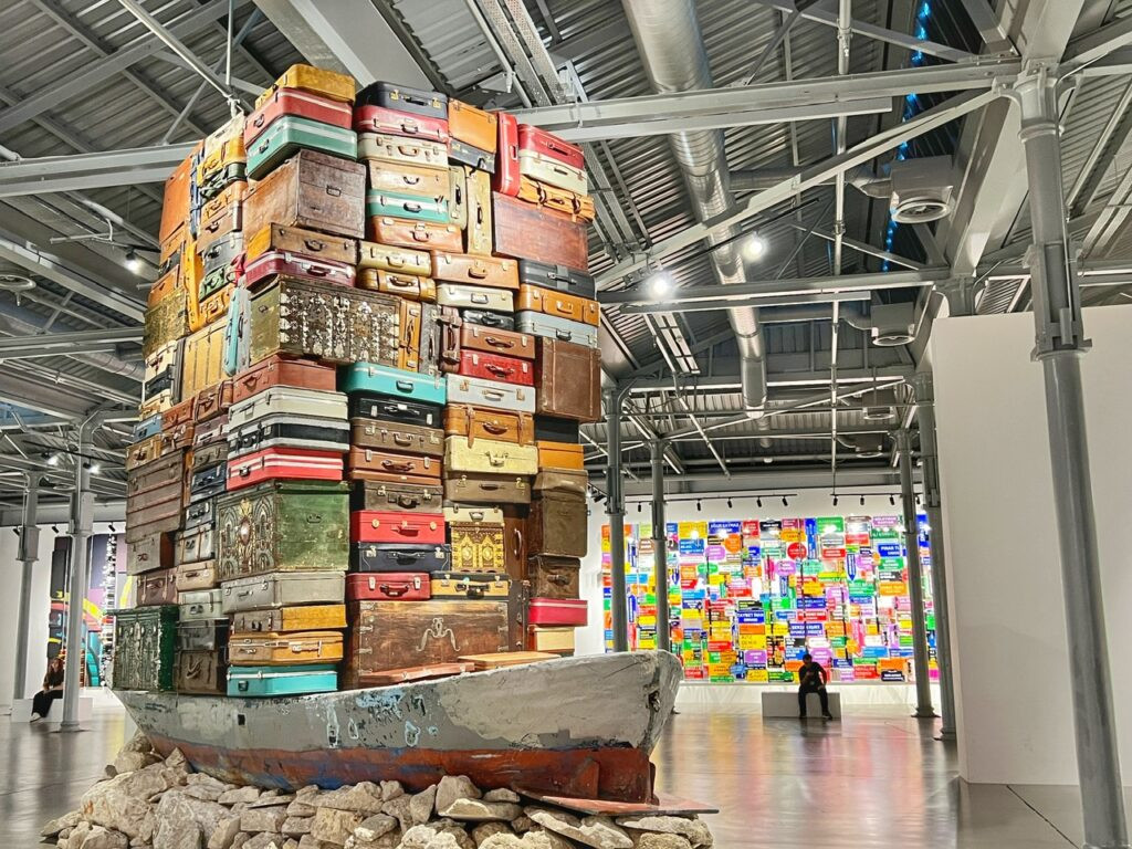 The most provocative piece for us was the rowboat heaped with suitcases of yesteryear floating amidst the gallery floor, which we gathered represents the life of a refugee. Coming from the inside of those suitcases came an eerie sound which added to the sensory experience….the gentle sound of a kitten crying.