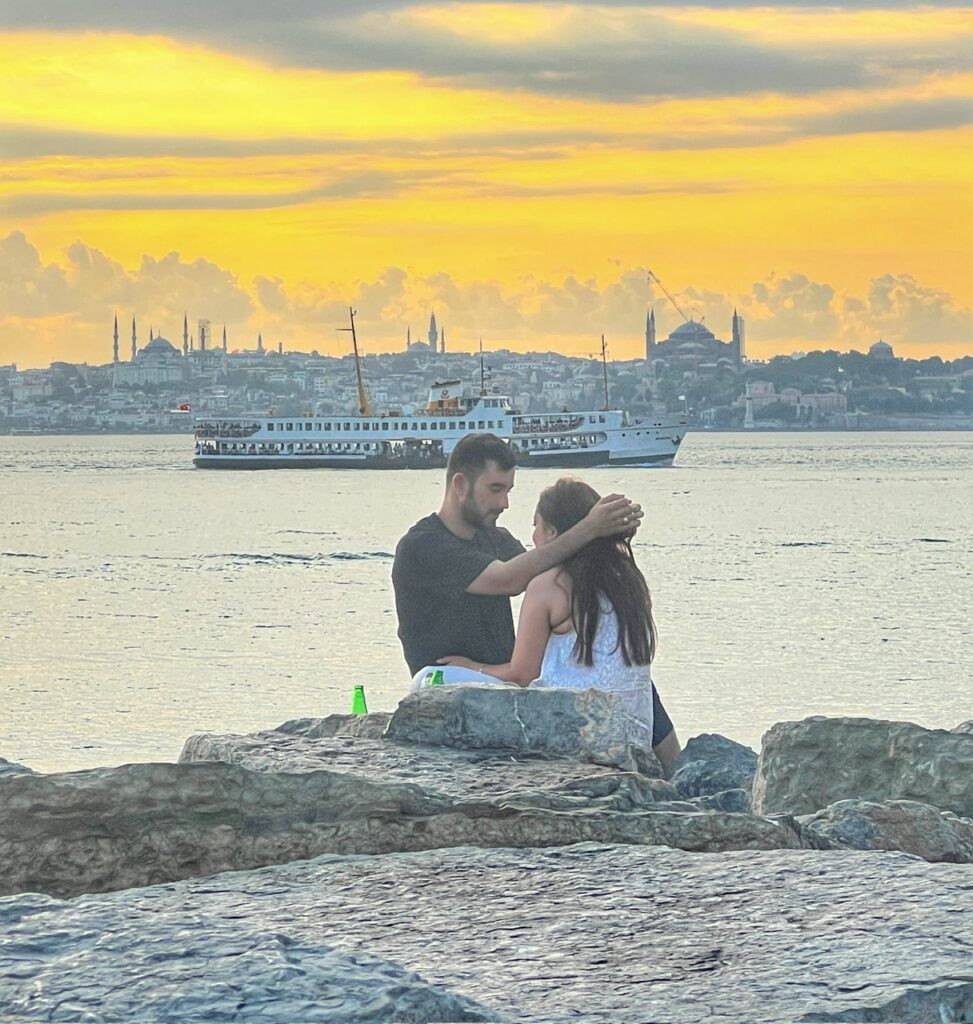 A bustling evening along the Bosphorus waterfront, and a couple canoodling at sunset