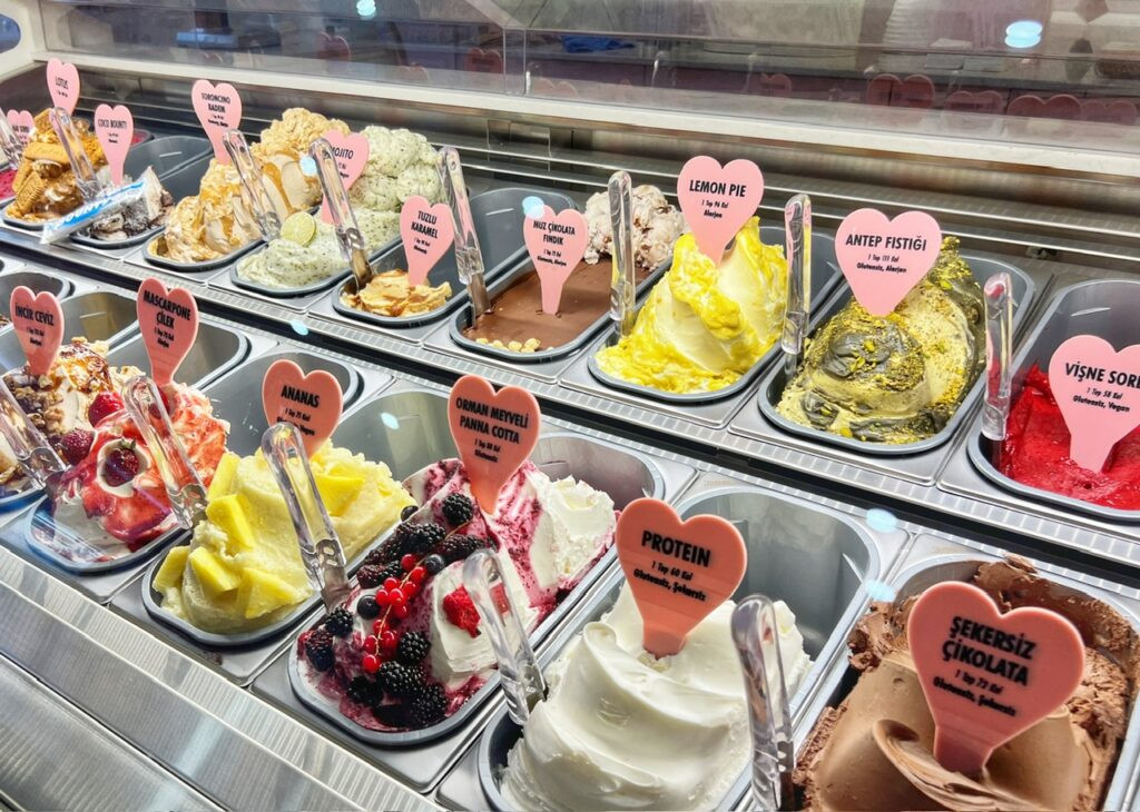 Alcohol, nor staying out all night, was happening for us in expensive Istanbul, so we instead gravitated to the other kind of sin…the enticing dessert counters. We settled for a minuscule piece of cold milk baklava… ($2.21) and a scoop of brownie gelato ($3.20). As your eyes float over the flavors, make sure to note one of them is called “Protein.” 🤣