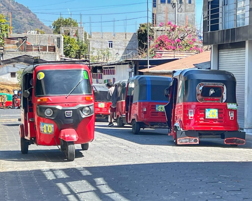 Later that morning, our short trip, was cut even shorter by the news that a semi accident was blocking the road we needed to get out of San Pablo. Therefore, our tour agency informed us we’d need to head to San Marcos to take the boat to Panjachel instead, before getting on a shuttle from there. So, this time, we hopped in a tuk tuk (Sarah’s first!) after I negotiated with the driver who started at a ridiculous 15 quetzales/$2 (per person!) for the less than five uphill minute ride.