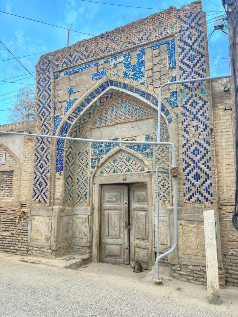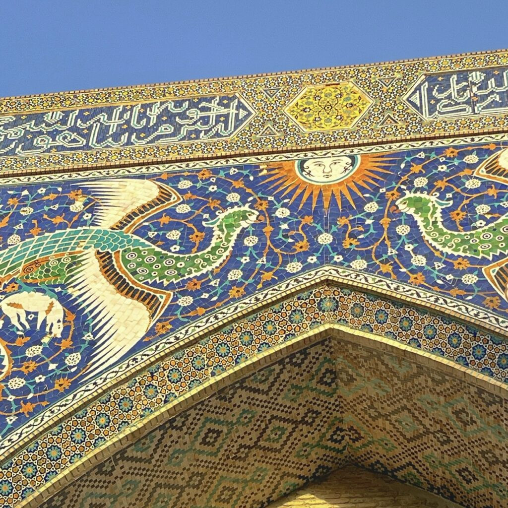 Atop the “madrasa,” peacock mosaics adorned the entrance. Like the tigers in Samarkand, they are unusual because Islamic art usually avoids depicting living creatures. Other than this, it’s one of the most mosaic-ed edifices in Bukhara…