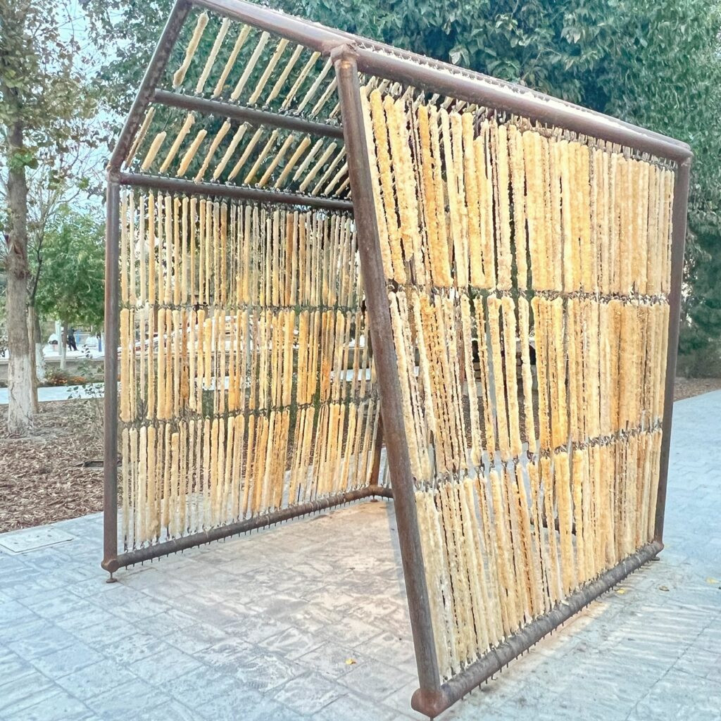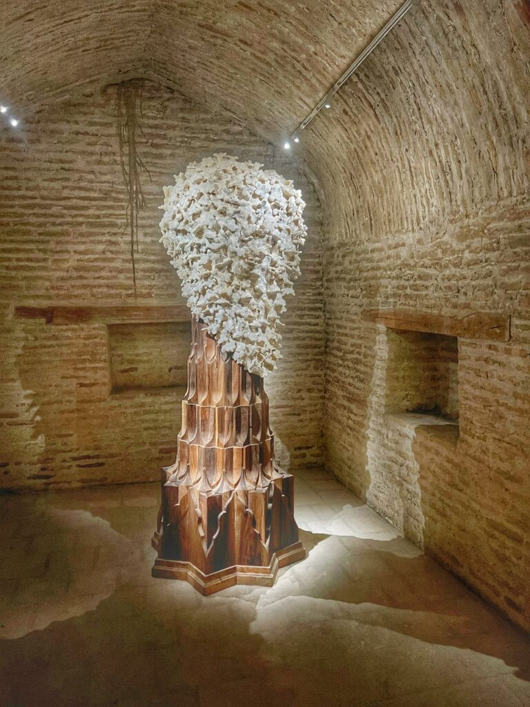The carved wood in this installation represents traditional muqarnas/minaret geometry entangled with nature in a honeycomb, topped by a swarm of honeybees. Together, the two elements suggest that history isn’t preserved by monuments, but by persistence and repetition.