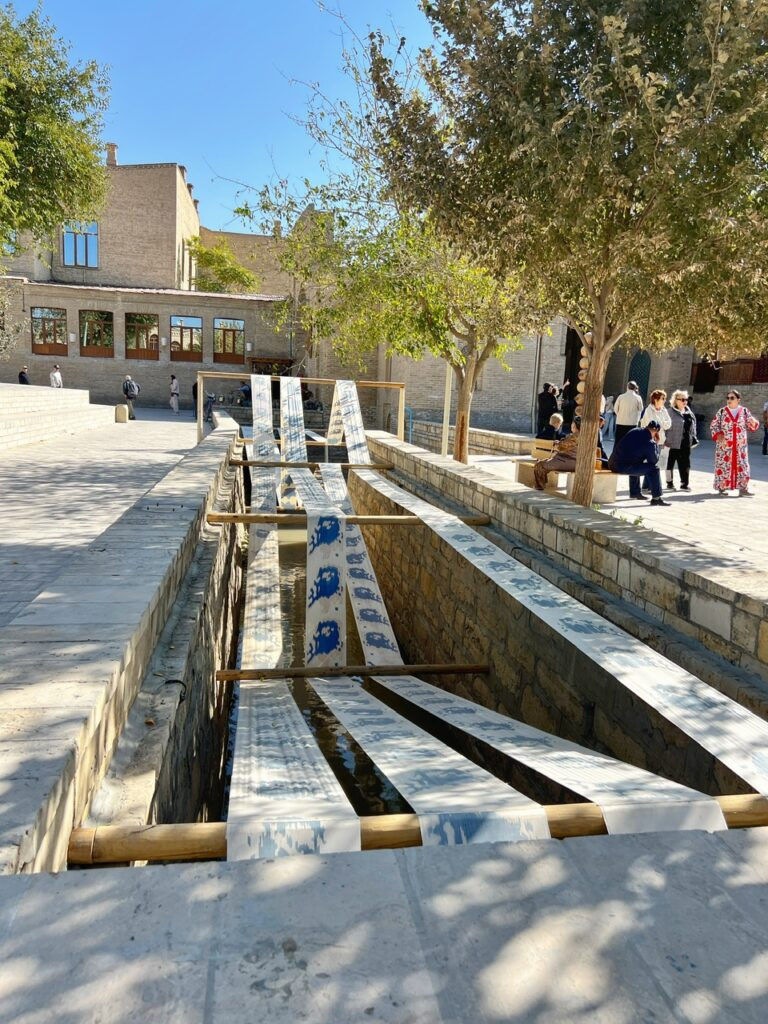 A traditional loom curiously bedecks the ancient waterways. As a major silk weaving center, this represents how historically canals powered wooden spinning wheels in Bukhara. Today, this poetic inversion of placing a loom OVER a canal represents the craft now controlling the water, not the other way around.