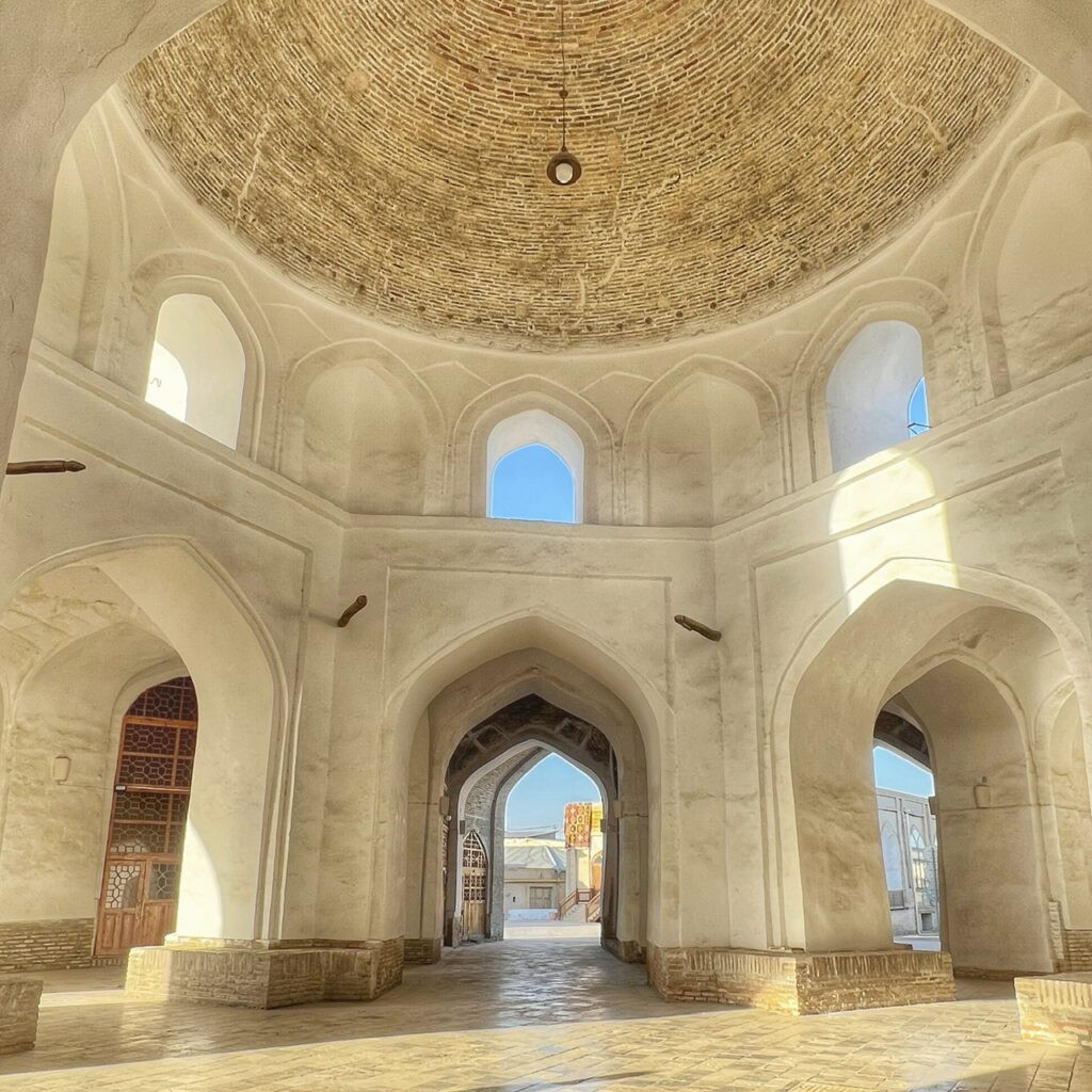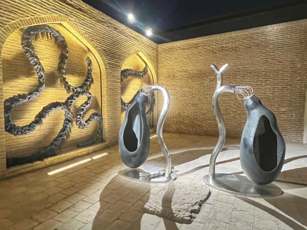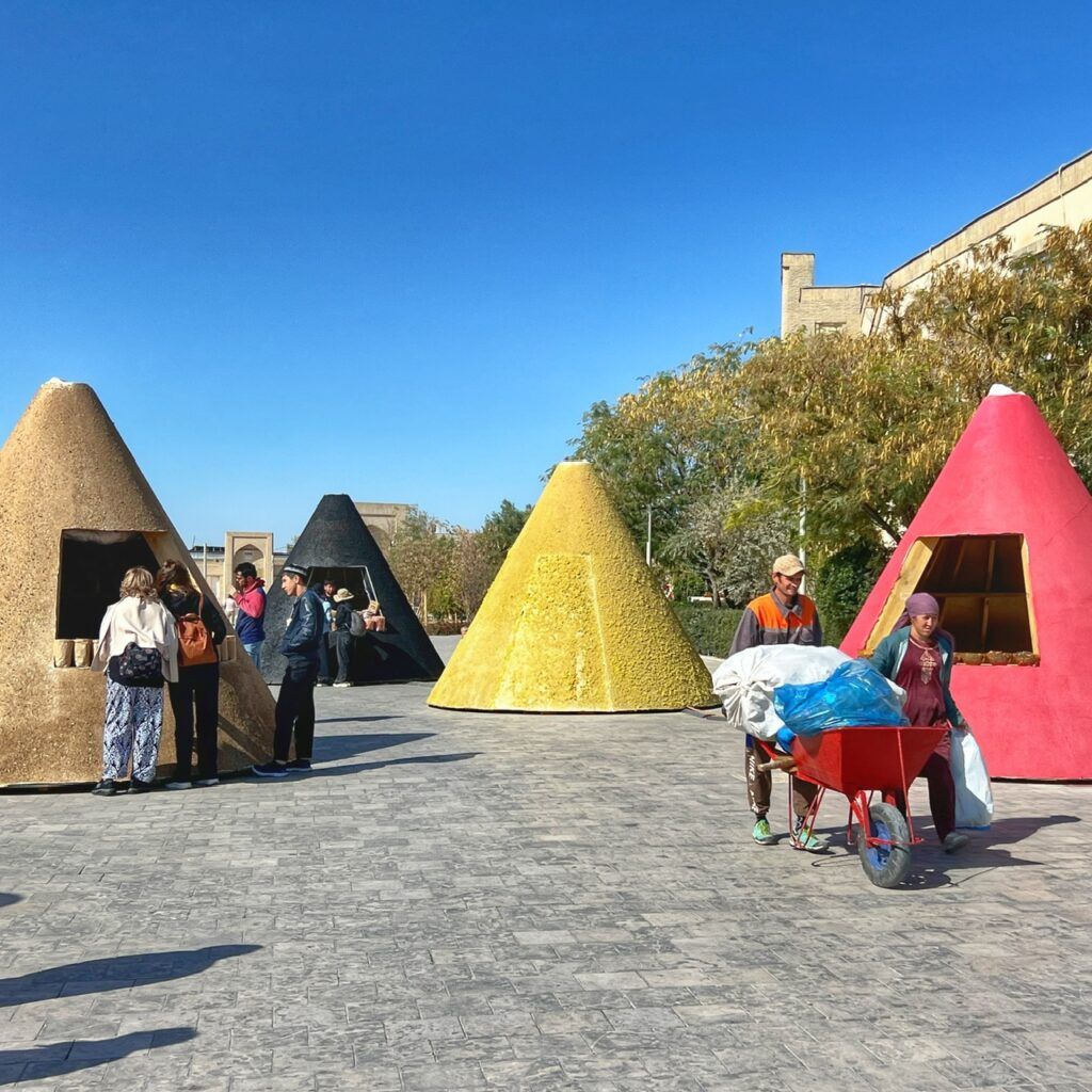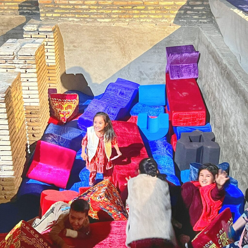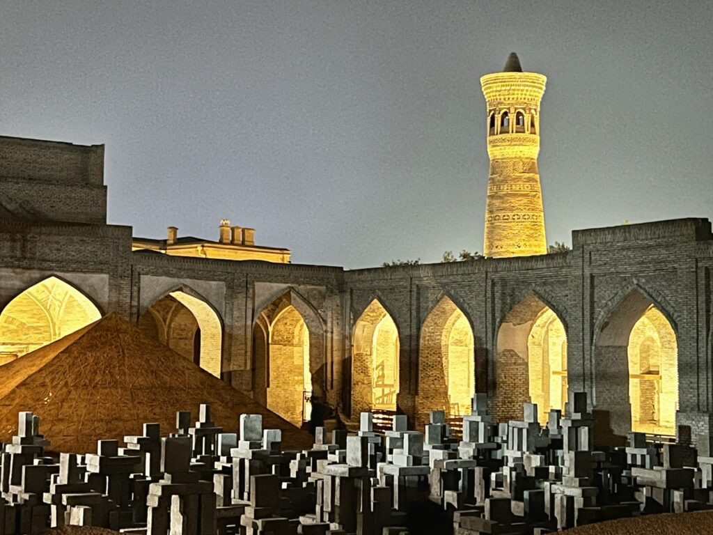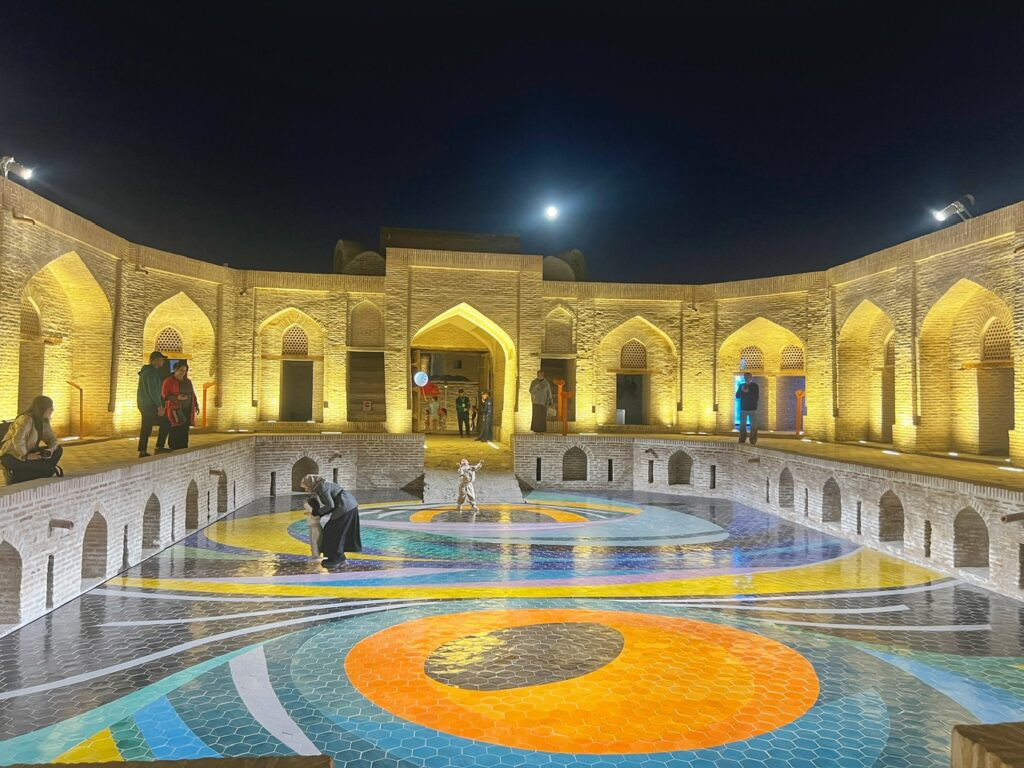 In case you’re not familiar, a caravanserai was a roadside inn built along trade routes along the Silk Road. They offered not only lodging for merchants and their caravans, but shelter for animals, which is what this beautiful mosaic floor once served as under an unchanged full moon. Today, the inn has evolved into a large-scale art gallery for the Bukhara Biennial 2025 which was conceived as a “transformative cultural intervention.”