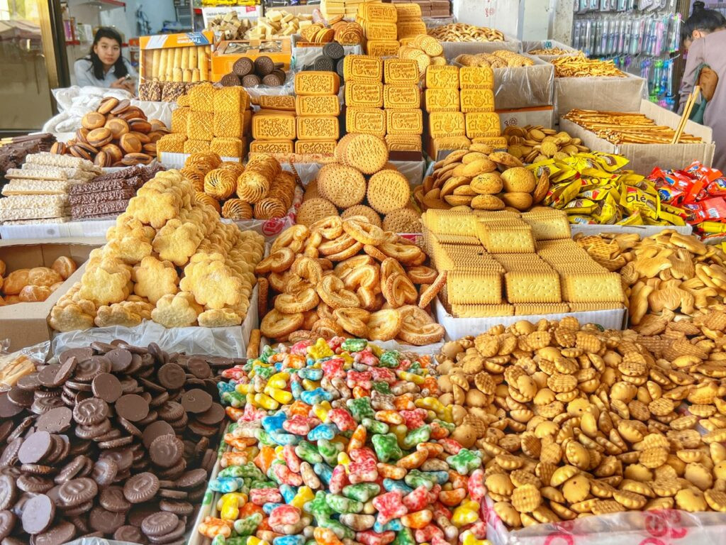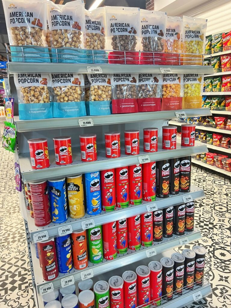 On the flip side, a “Mega Market” was the only supermarket we could find within about 35 minutes walking distance from the historic center. It was big enough to have the essentials we needed, which did not include handfuls of biscuits from their open displays. This has also been a common set-up we’ve seen in Central Asia…exposed cookies. Doesn’t anyone have concern for staleness?