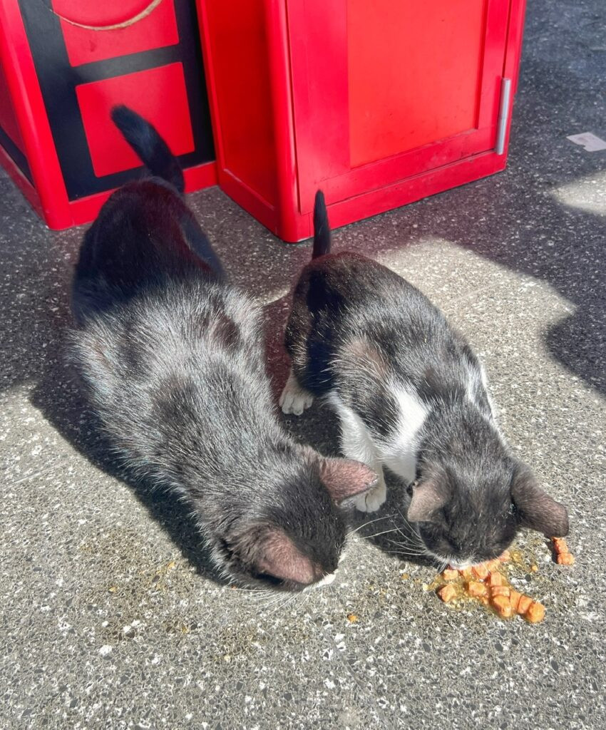 The kind local, who didn’t speak any English, and I, tried to problem solve by dangling the food near the plastic box area of the escape hole. Eventually, when I held the bag up high toward the back corner, something clicked as the cat sprang towards it and frighteningly plunged himself back the escape shoot. Greg arrived just in time to experience the break away…and we rewarded (both) cats for a job well done.