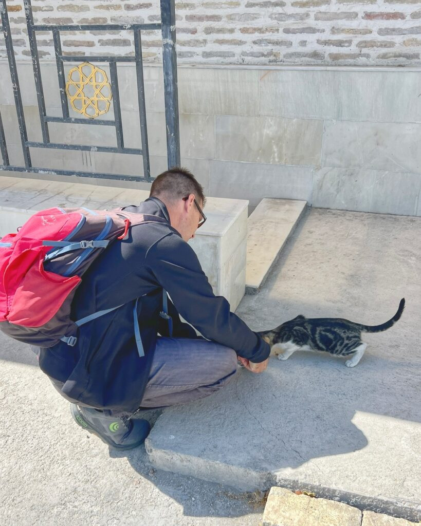 We alerted the store worker, who shrugged and really didn’t seem to know what to do, and then Greg went to buy some cat food. While he was gone, I was joined by a local lady, and perfectly quiet three-year-old, who already had a bag of cat food in her hand. The trapped kitten was clearly elated to spot this treasure, but still utterly confused on how to reach it. It was wet food, so we couldn’t just toss a handful in the hole without making quite a mess, so I tried to blow the smell into the hole so the cat would get the connection.