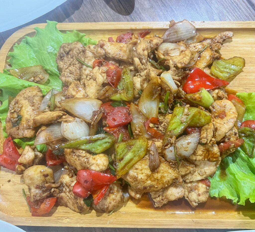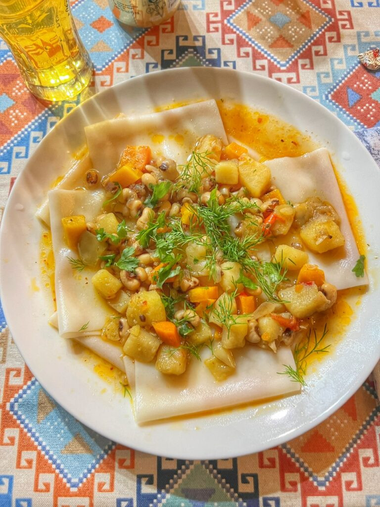 At Xon Atlas, a tourist restaurant, we had “Kayish Shilpildok”, which was hand-cut boiled dough pieces flopped blanket-style on a plate, topped with vegetables and beans for $4. While it looks kind of interesting, it was quite flavorless.