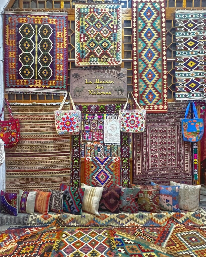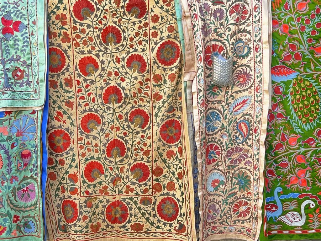 Some of the exquisite handmade products you can find in Uzbekistan including: hand-woven area rugs, which are undoubtedly more affordable in Uzbekistan than in Turkiye. And embroidered table cloths and runners. Thank goodness we don’t have a house…we’d be in trouble here! It’s truly home decor paradise!
