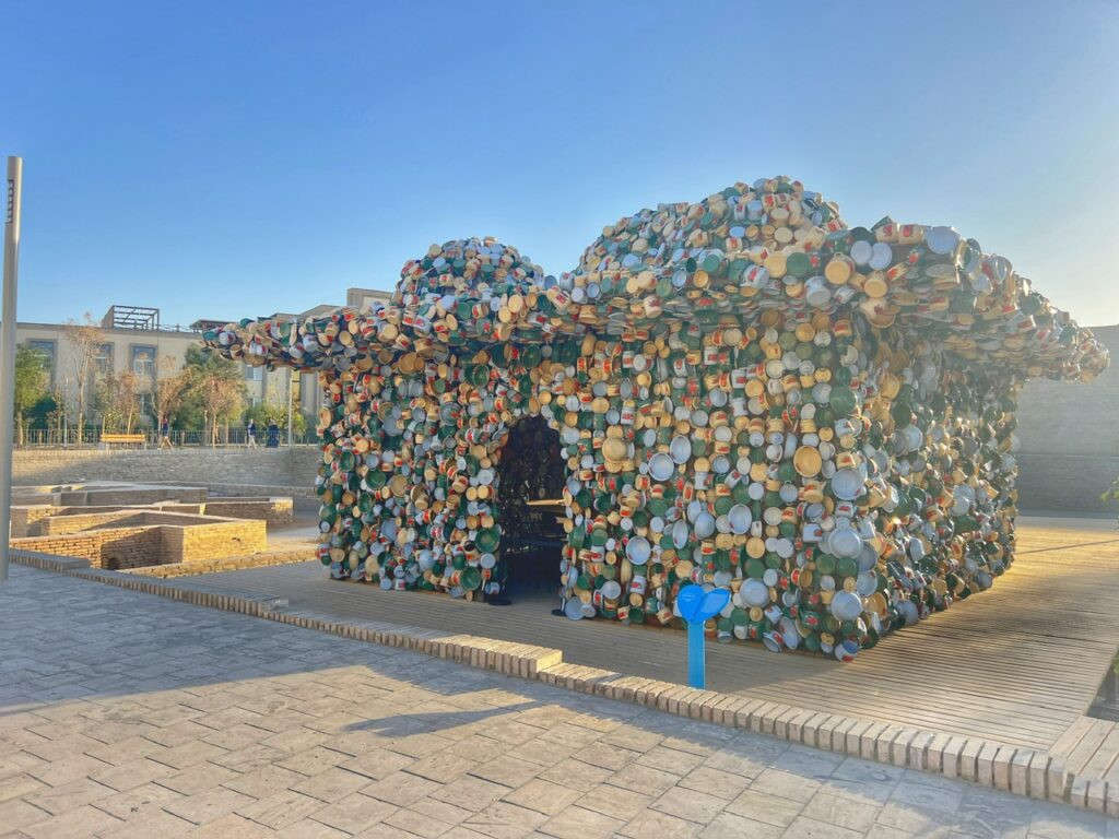 An entire structure blanketed in enamelware plates, bowls, cups and cooking pans, references communal dining across Central Asia. These very types of dishes have donned many tables we’ve eaten at throughout our journey in the last few months.