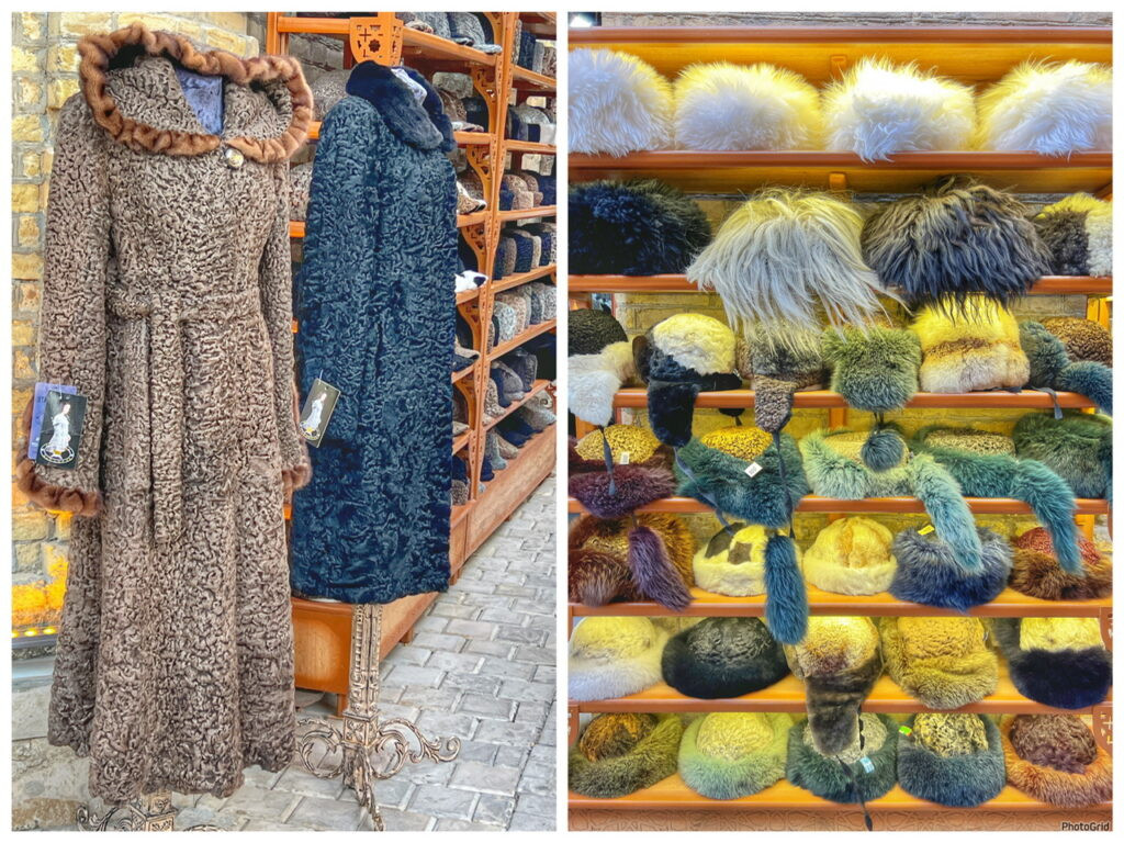 If you’re in the market for winter wear, Uzbekistan is the place for cozy attire. We’ve never seen such beautiful and fun winter coats and accessories. Unfortunately (fortunately) for us…we don’t do winter anymore. 😂 Also, it didn’t really occur to us until after the fact the brutal killing that goes into some of these beautiful accessories.