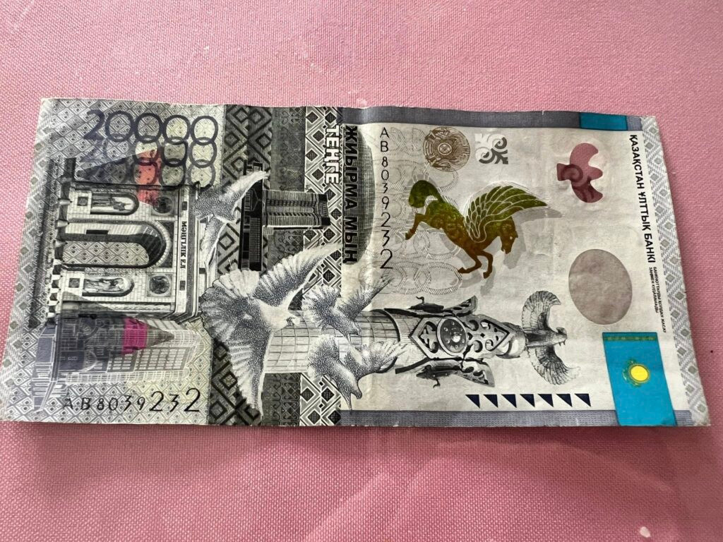 A colorful Kazakh Tenge. This 20,000 note (valued at $37) had been unspendable so far. They’d rather have credit cards because they don’t have change.