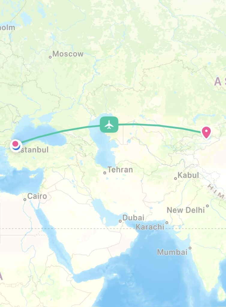 Our flight was five hours non-stop to Almaty, the largest city in Kazakhstan. We left at 8:55 pm, and with the three hour time change, arrived at the spritely hour of 5. Thank goodness for that nap, although the seats on budget Pegasus Airlines are surprisingly plush. Not. 🤣