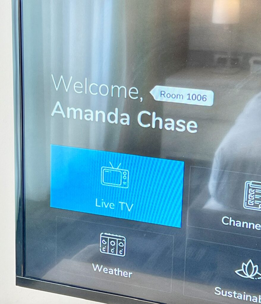 Considering this level of poshness is normally way above our budget grade, we were kinda gleeful. Oh wow! My name is even on the TV!! That’s a first! 😄