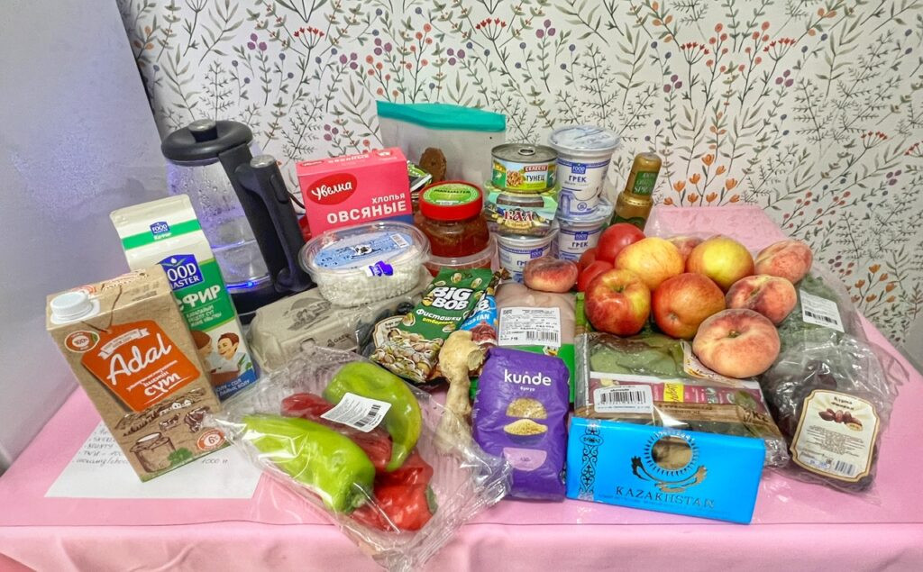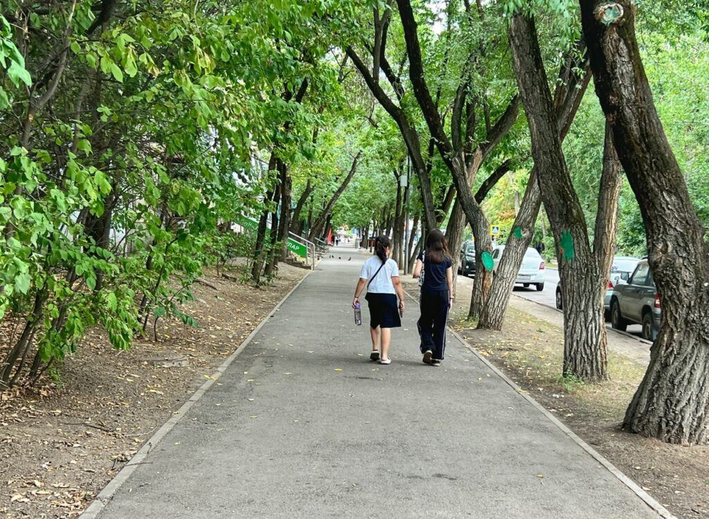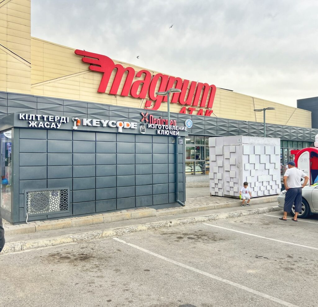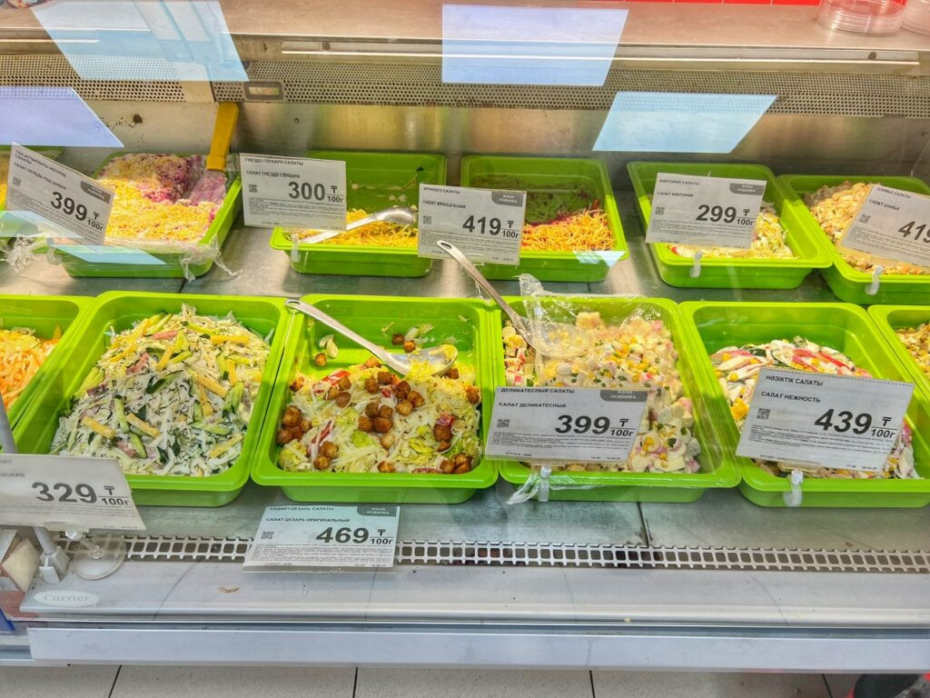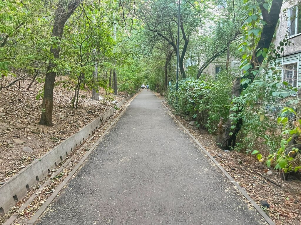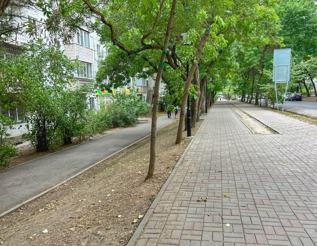 After some rest and a 1 p.m. breakfast (hey! It’s like college again!), we headed to the nearest big supermarket, which was a 13-minute walk from our place. This is when we learned…wow…Almaty, at least where we we’ve landed, is extremely pleasant and walkable! Some places even had TWO sidewalks!! All wide, clean and without any tripping hazards.