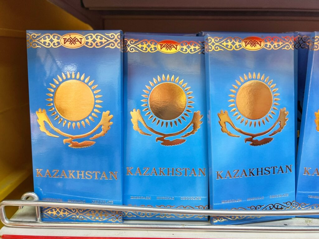 A few things we noticed in the market when we weren’t trying to whack our way through the Cyrillic…Kazakhstan has their own brand of chocolate in eye-catching packages. We got a dark chocolate bar, which seems to be about 50% cacao. Still quite tasty.