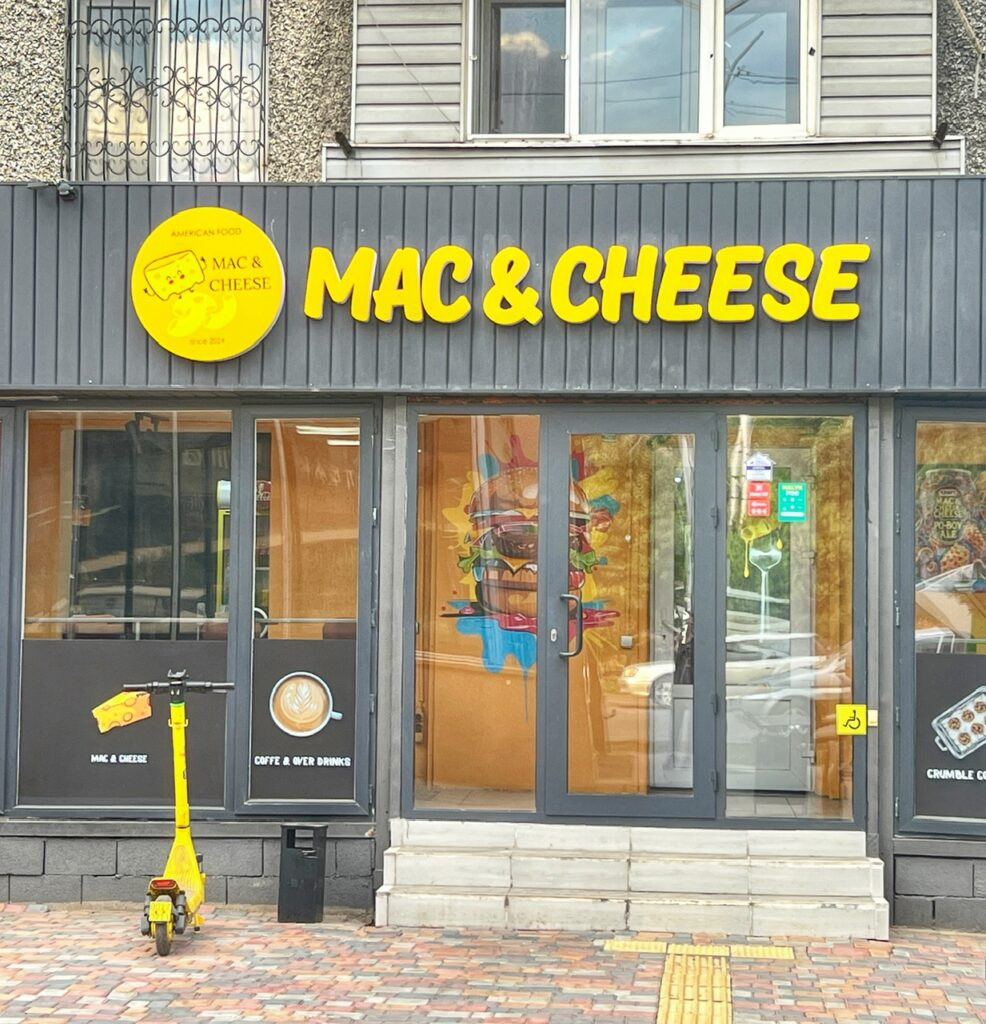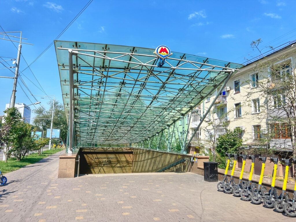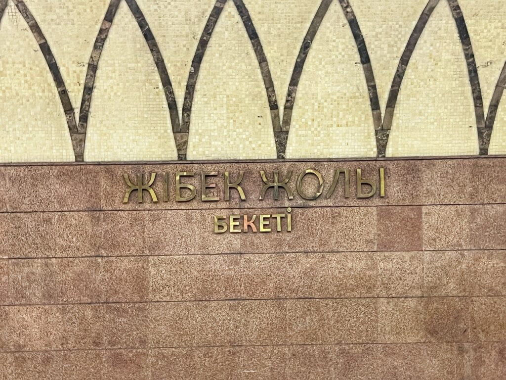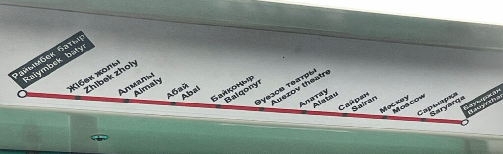 There is only one metro line in Almaty with 11 stops. It cost $.22 a ride and can be paid for using your contactless credit card on your phone. You will notice that the signage is in Russian and with Latin letters. Most places, only Russian and/or Kazakh is available.