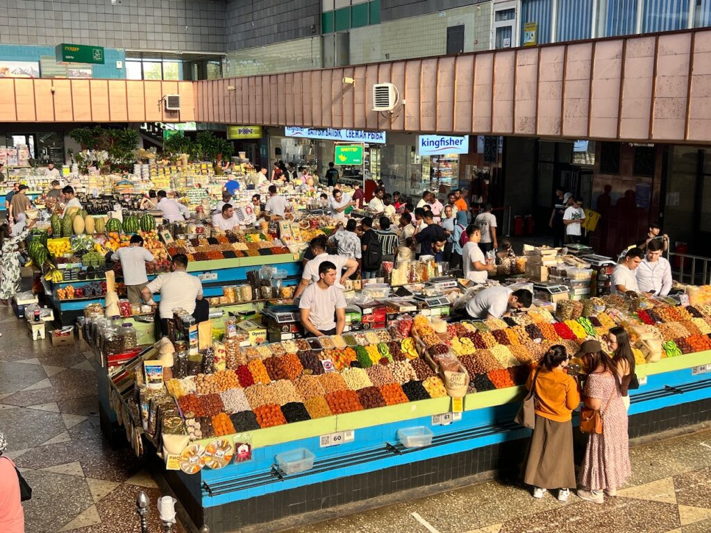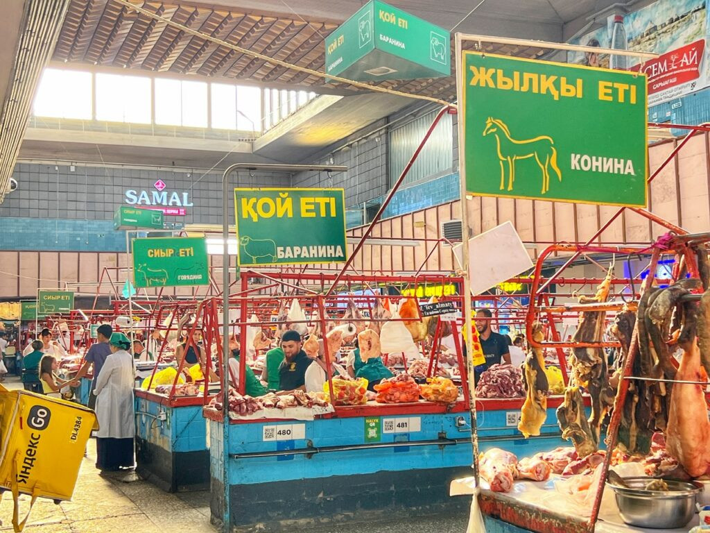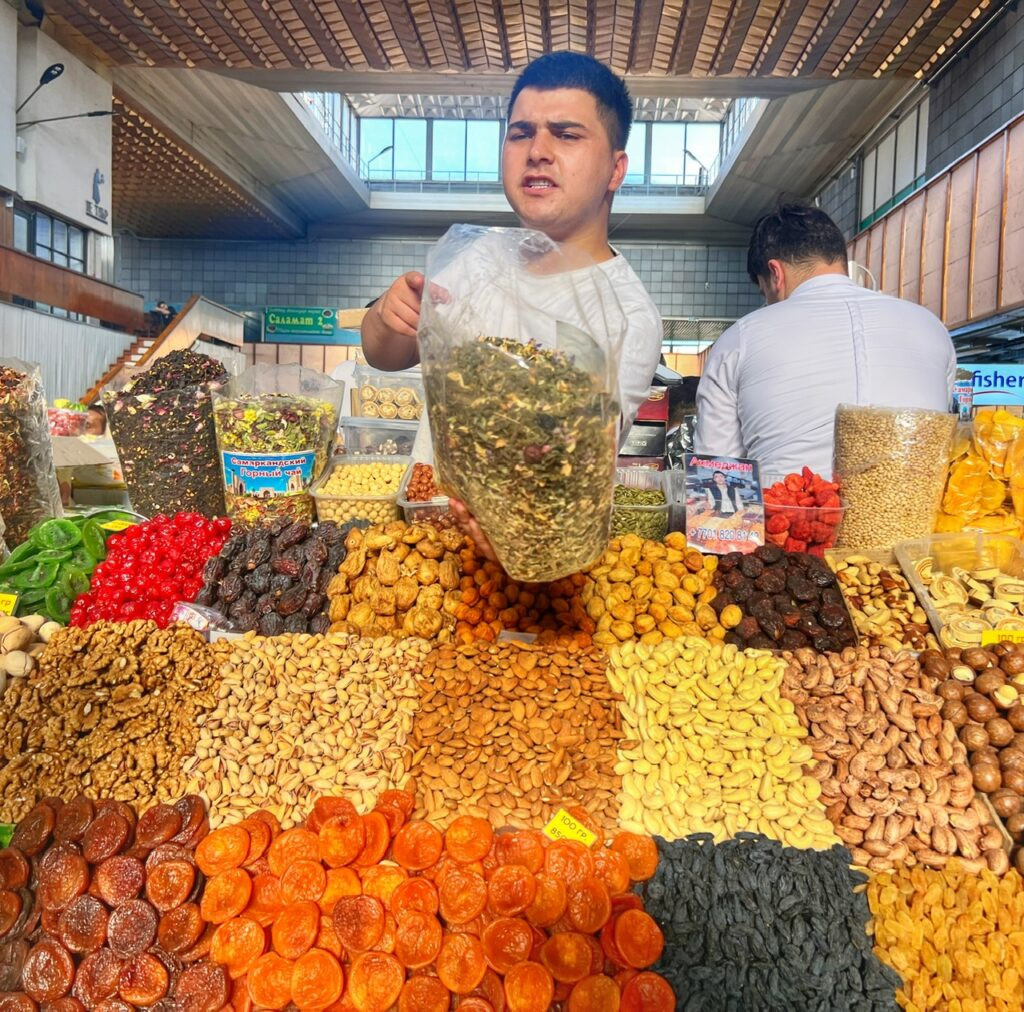 Of course while in Almaty, we had to check out the Zelyony (Green) Bazaar, which is truly an immersive and energetic local market experience, which began in 1875, serving traveling merchants and caravans. Today it also attracts many travelers, so as soon as you walk through the door and pause to admire the stunning displays of dried fruits and nuts, you appear to have “TOURIST” plastered on your forehead. Because of this you are naturally thrust with offers to start sampling, (but only what they give you—don’t touch!), followed by light pressure to buy.