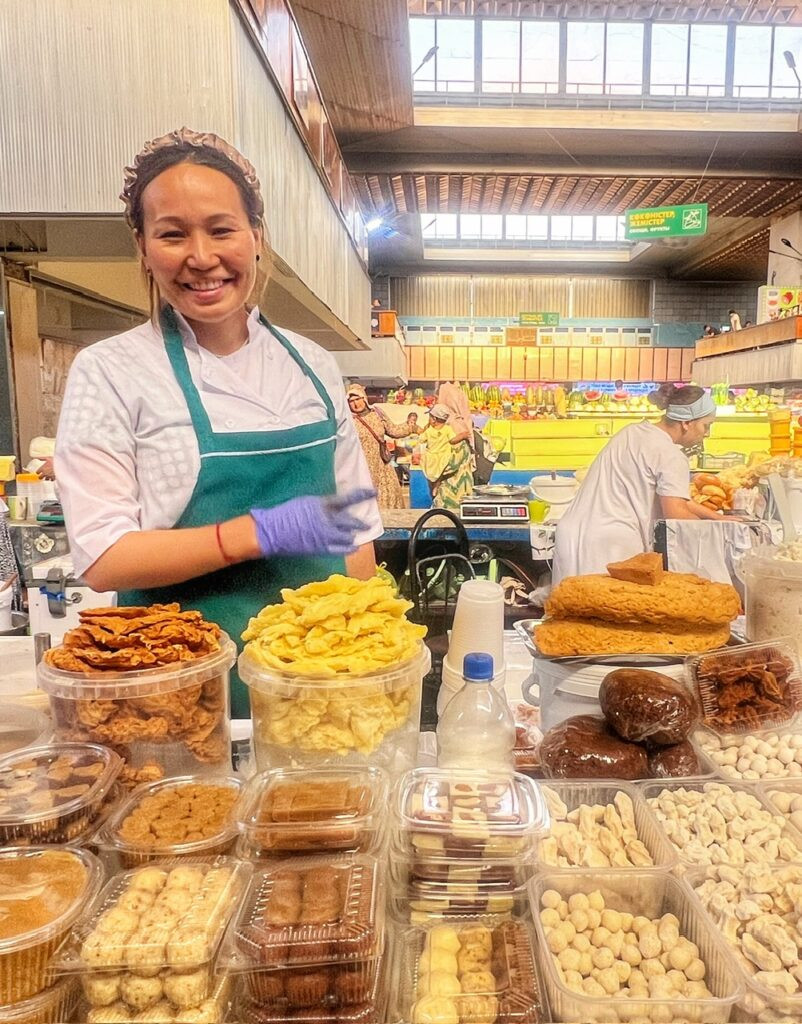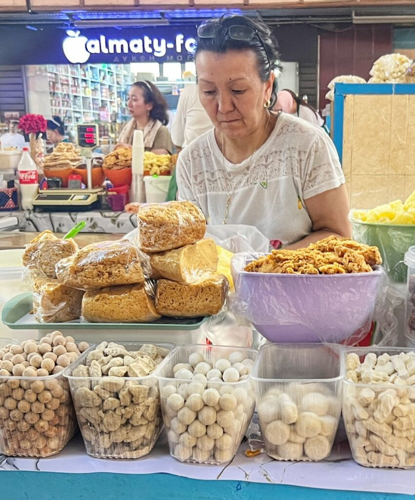We also had a lovely chat with this smiling lady who spoke English and was selling all types of traditional Kazakh dairy and cheese “treats”, which she allowed us to sample individually. Some of them were sweet, some salty, some tangy, and some fermented.