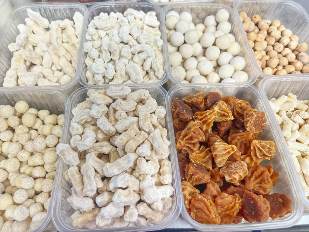 To the right was all various forms of Kurt, or dried, salted cheese curds made from soured milk or yogurt. The lady did the best sell for the one in the bottom right corner, which is still Kurt, but with “sweetened or caramelized milk curds.” To us, they looked and tasted more like…this particular emoji 💩.