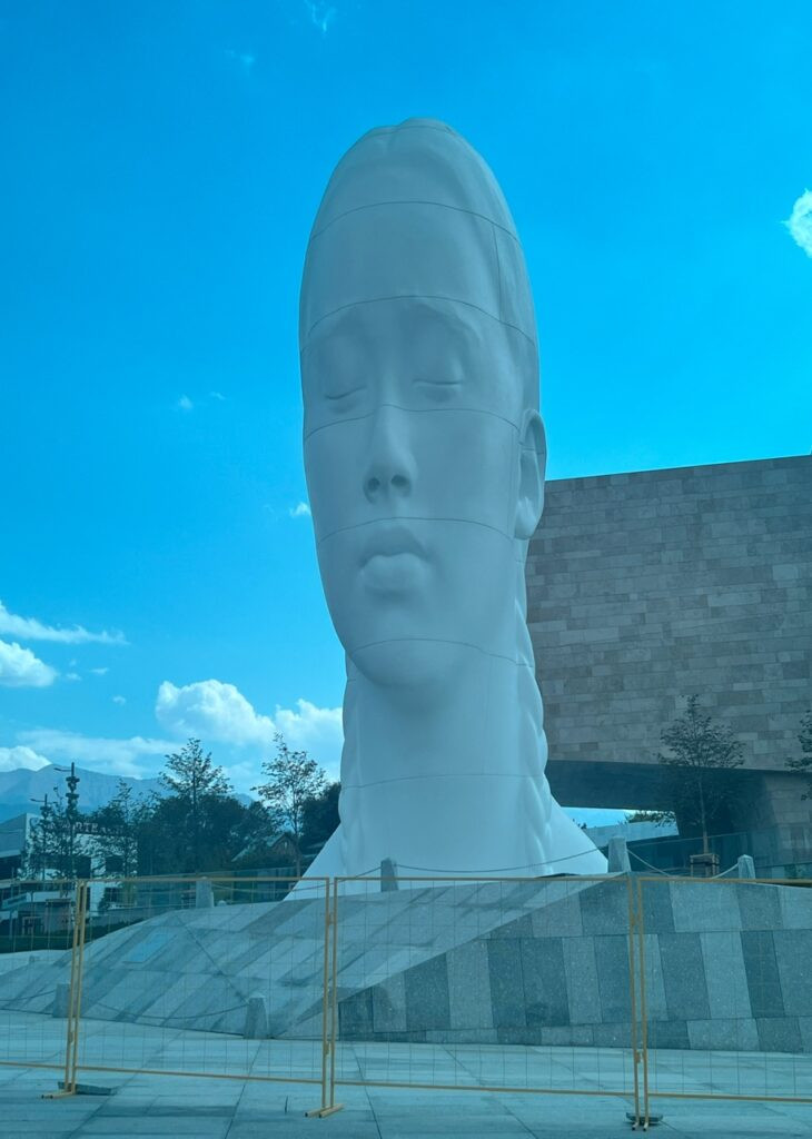A giant sculpture, seemingly indigenous, in front of the art museum