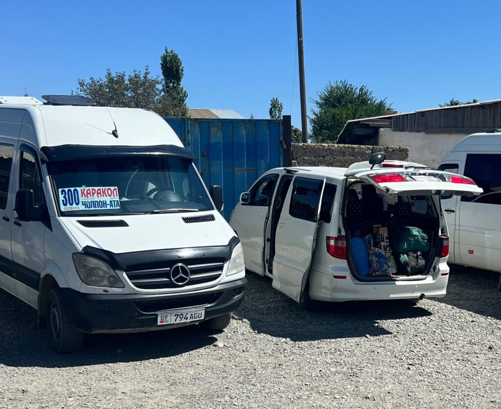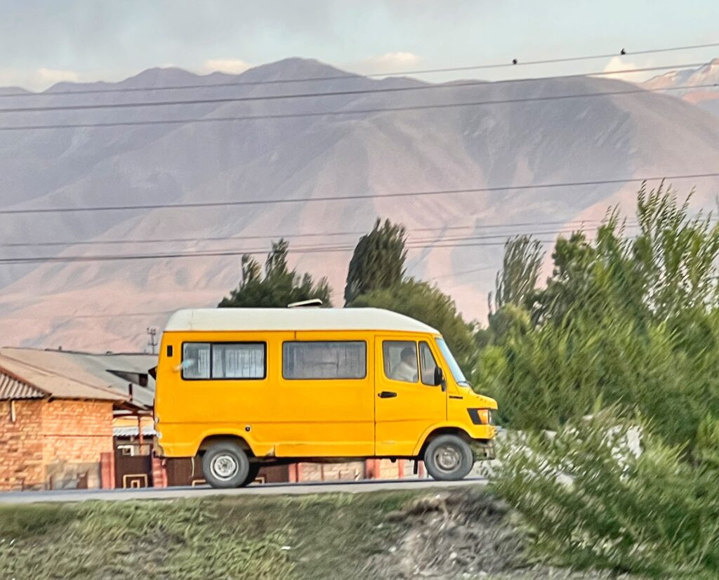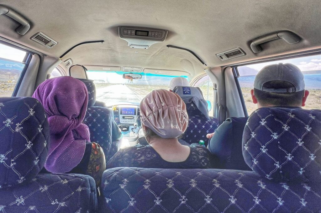 Crammed into the back of our shared taxi, full of people with amusing headgear…we felt a bit envious. 😆 The marshrutkas leave about hourly from Karakol for Balykchy, but only once they are full. When you arrive to Balykchy, you park in a lot on the side of the road which seems to be where the marshrutkas congregate. Here, you will probably be approached for a shared taxi to Kochkor, which is basically a fun-size mini van instead of a super-sized full van. We paid 300 som/person, down from 400, which we think was a bit inflated.